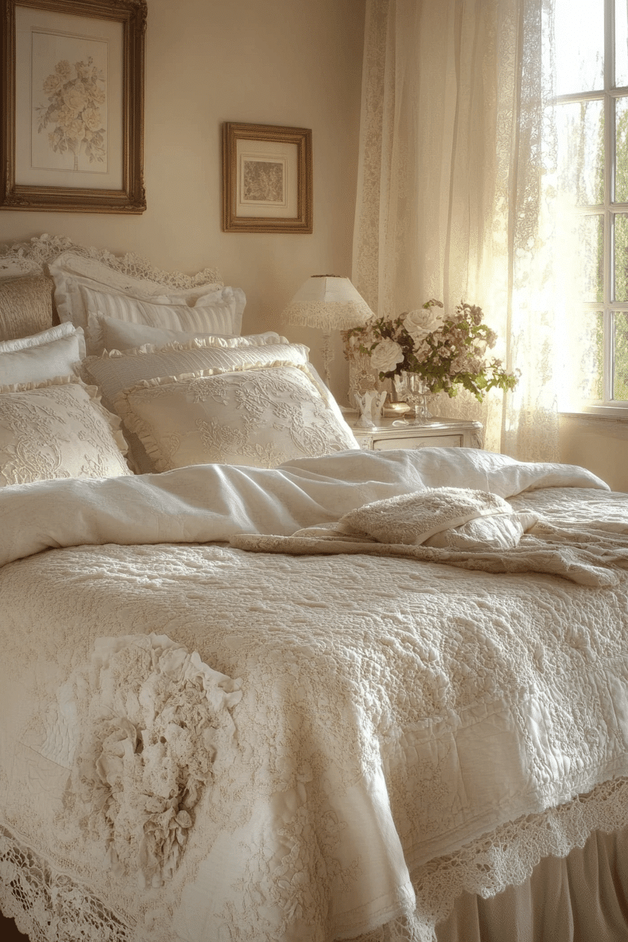Romantic layering creates a soft bedroom that feels luxurious and enchantingly beautiful. This shabby chic bedroom emphasizes multiple textile layers and vintage charm. Delicate colors and flowing fabrics enhance the romantic aesthetic. The atmosphere feels like a dreamy love story setting. Every detail supports romance and comfortable elegance. Discover more romantically layered shabby chic bedroom ideas.