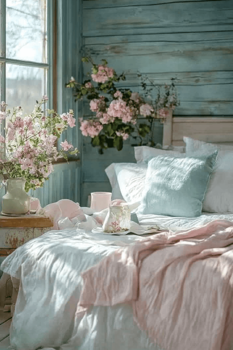 Gentle color hues create a cozy bedroom that feels harmonious and inviting. This shabby chic bedroom uses muted pastels and soft tones throughout. Vintage furniture and accessories add character and charm to the space. Layered textures enhance the cozy and comfortable atmosphere. Every detail supports a peaceful and restful environment. Discover more soft-hued shabby chic bedroom inspiration.