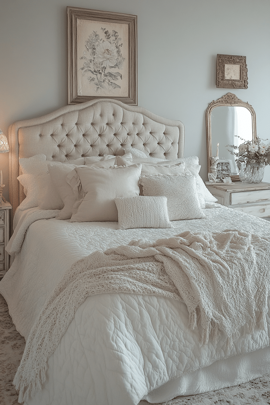 Cloud-like softness creates a cozy bedroom that feels light and comfortable. This shabby chic bedroom emphasizes soft textures and pale colors. Vintage furniture and fluffy fabrics enhance the cloud-like aesthetic. The atmosphere feels gentle and peacefully inviting throughout. Every detail supports a sense of floating comfort. Find more cloud-soft shabby chic bedroom ideas.