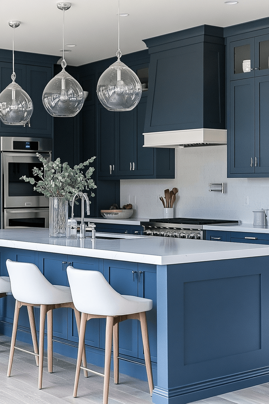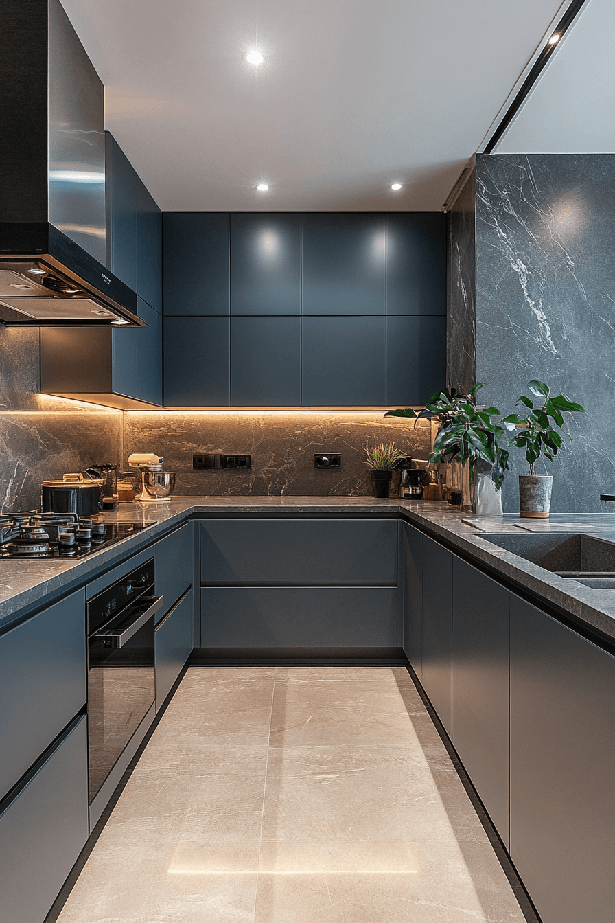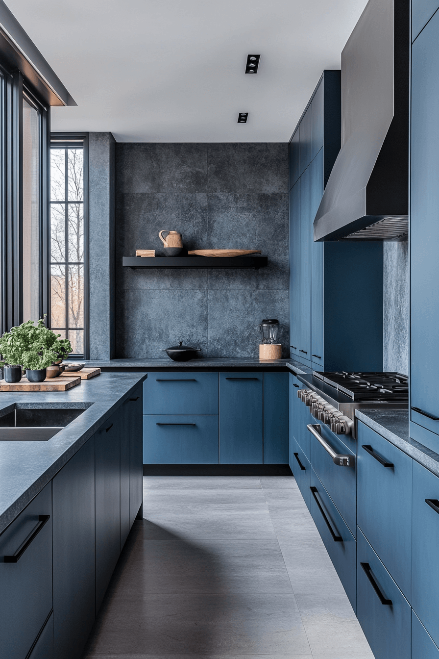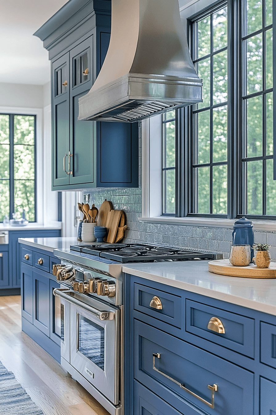 Strong visual contrast is effortlessly achieved using slate blue kitchen cabinets alongside crisp white surfaces. The color instantly defines the space with clarity. Bright lighting and reflective finishes keep the look sharp. Subtle metallic accents add a polished edge. The kitchen feels bold yet clean.