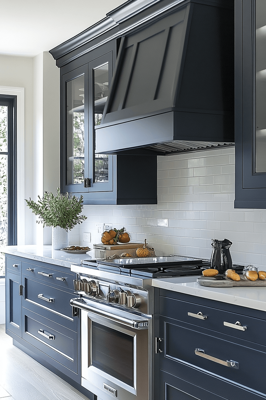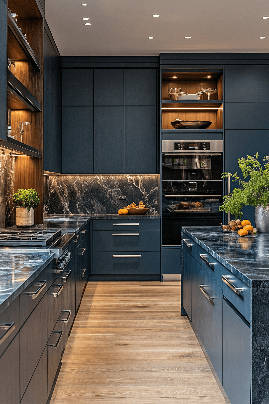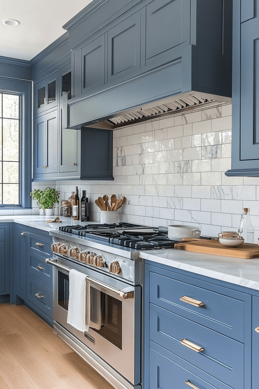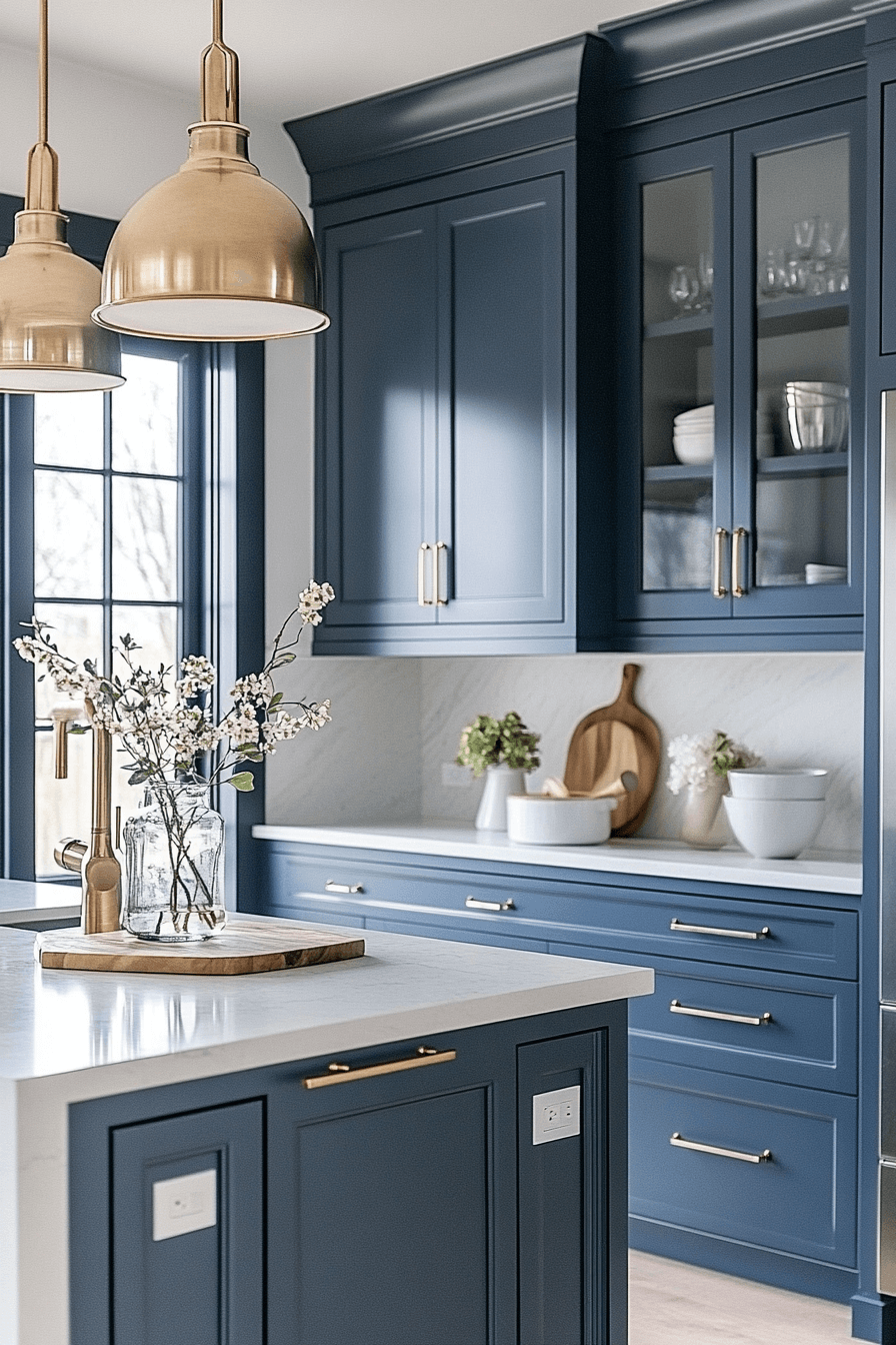 Strong visual contrast is effortlessly achieved using slate blue kitchen cabinets alongside crisp white surfaces. The color instantly defines the space with clarity. Bright lighting and reflective finishes keep the look sharp. Subtle metallic accents add a polished edge. The kitchen feels bold yet clean.