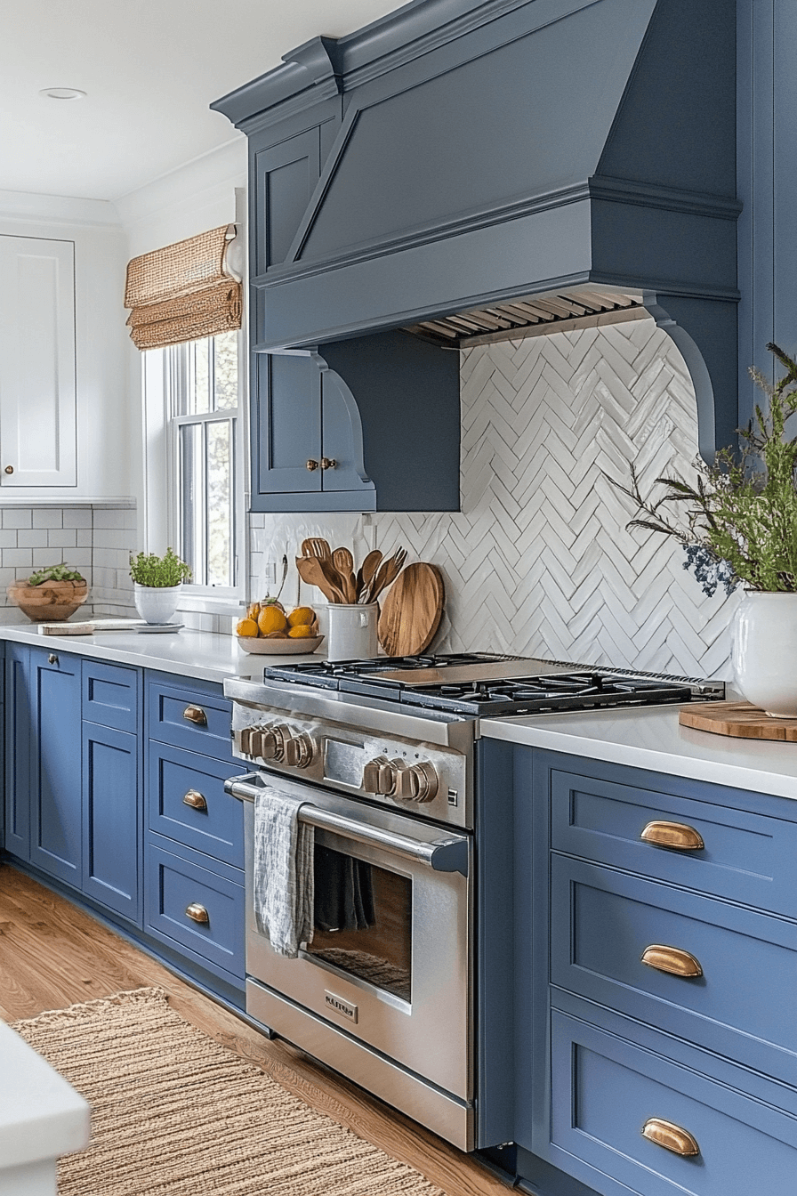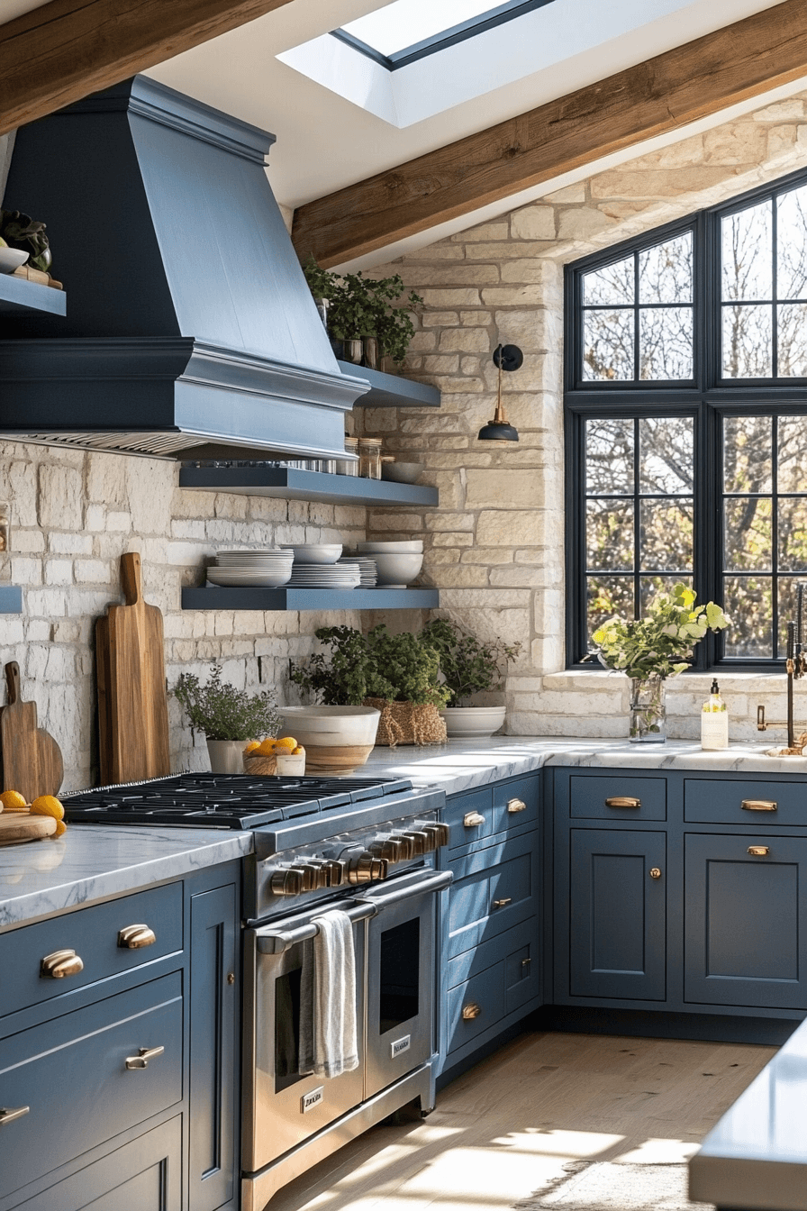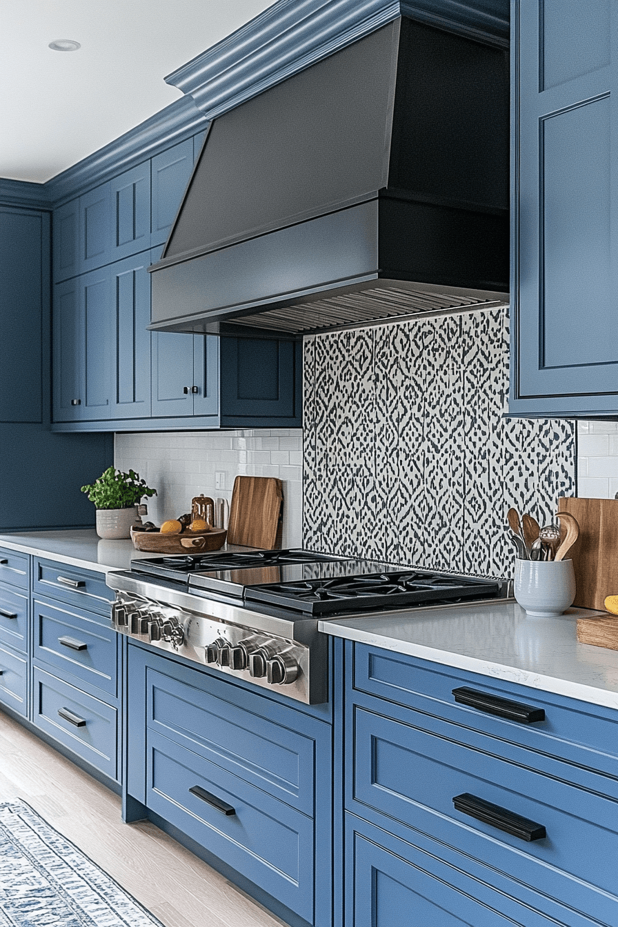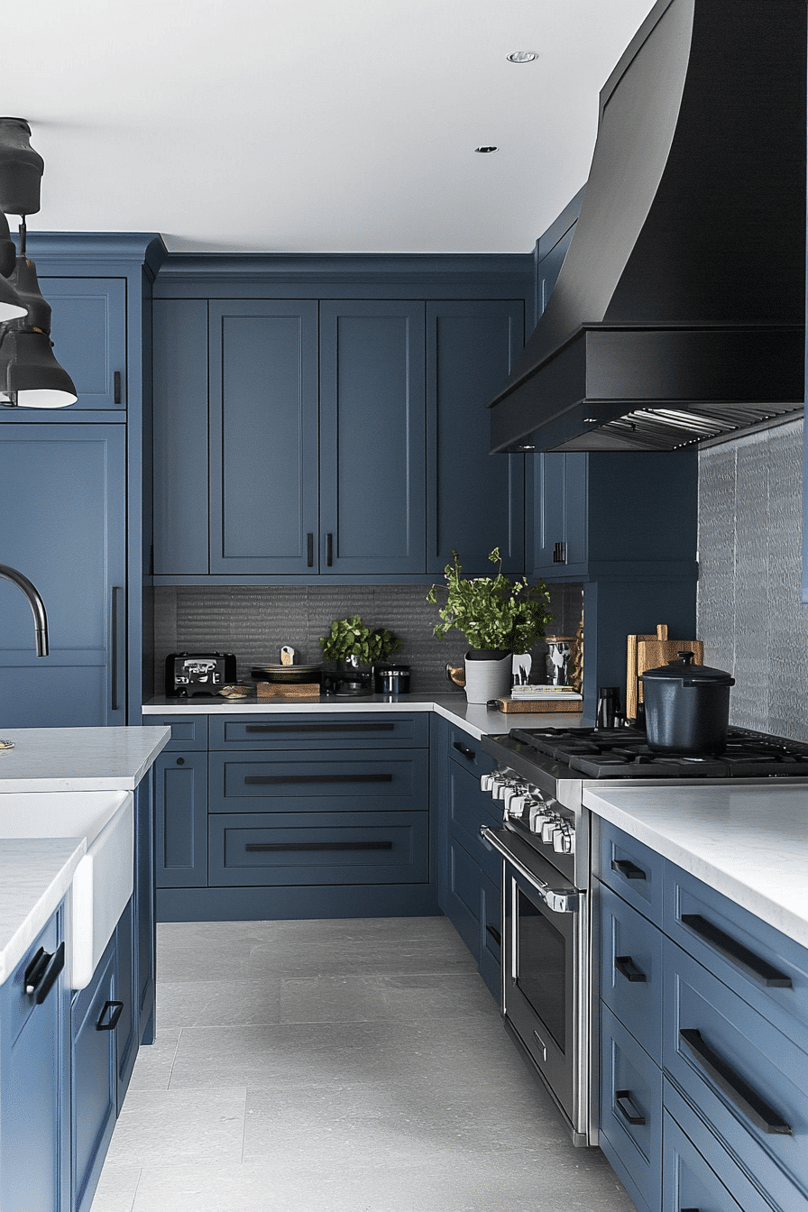 A strong design statement starts with slate blue kitchen cabinets that anchor the kitchen in confident style. Their cool undertone delivers impact without feeling overwhelming. Crisp whites and structured patterns help the color stand out beautifully. Metallic or black accents introduce an edgy contrast. The finished space feels modern, bold, and composed.