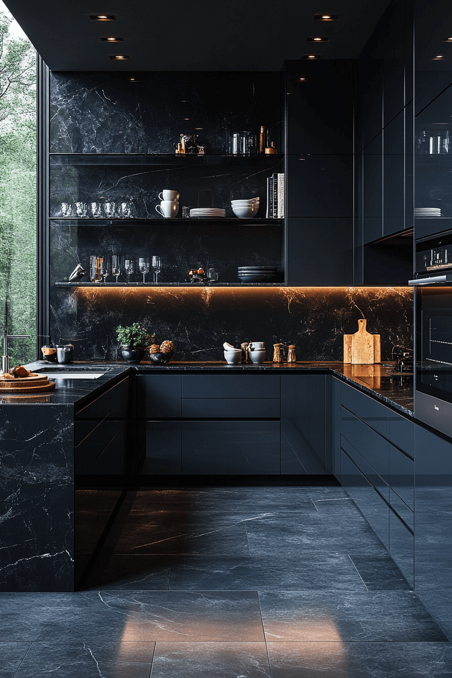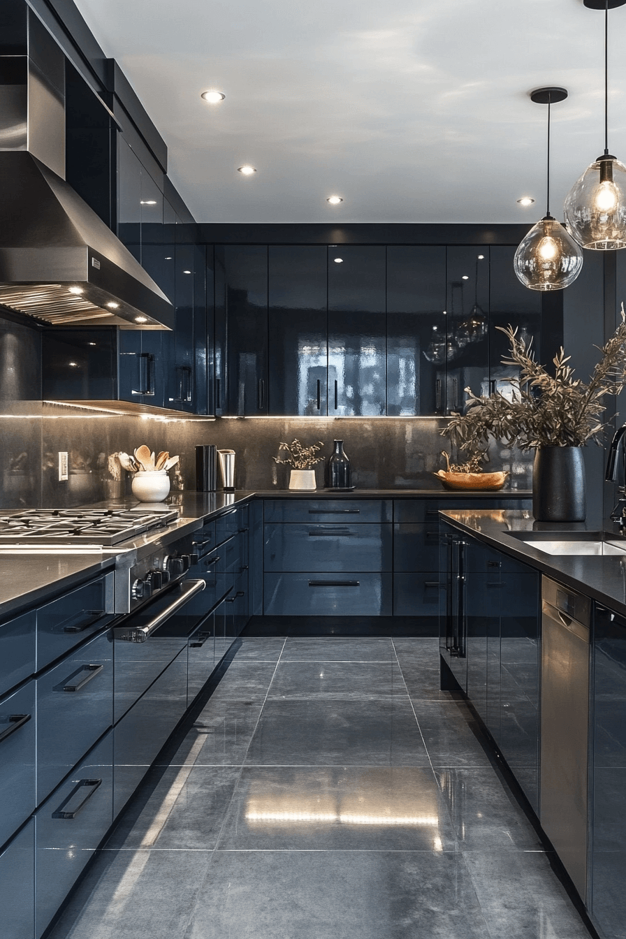 A dramatic yet controlled atmosphere emerges when slate blue kitchen cabinets anchor a modern design. Their deeper tone introduces mood without closing in the space. Glossy surfaces and soft lighting add visual movement. Clean lines and contrasting hardware enhance the modern appeal. The result feels stylish and composed.