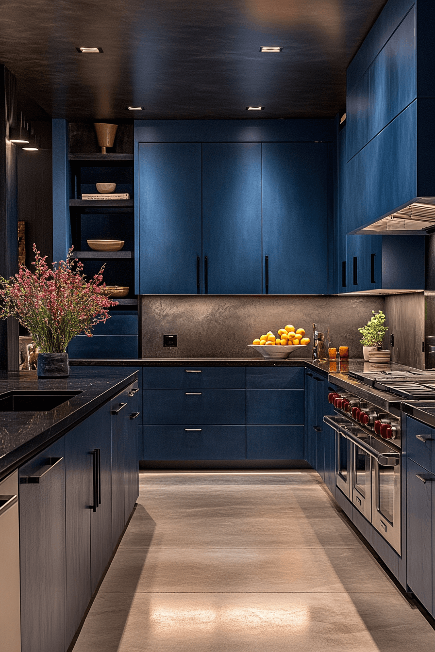 Contemporary sleekness is embodied by slate blue kitchen cabinets with smooth, uninterrupted surfaces. Their cool tone commands attention subtly. Slab counters and integrated lighting reinforce a seamless look. Modern pendants add sculptural interest. The design feels strong yet restrained.
