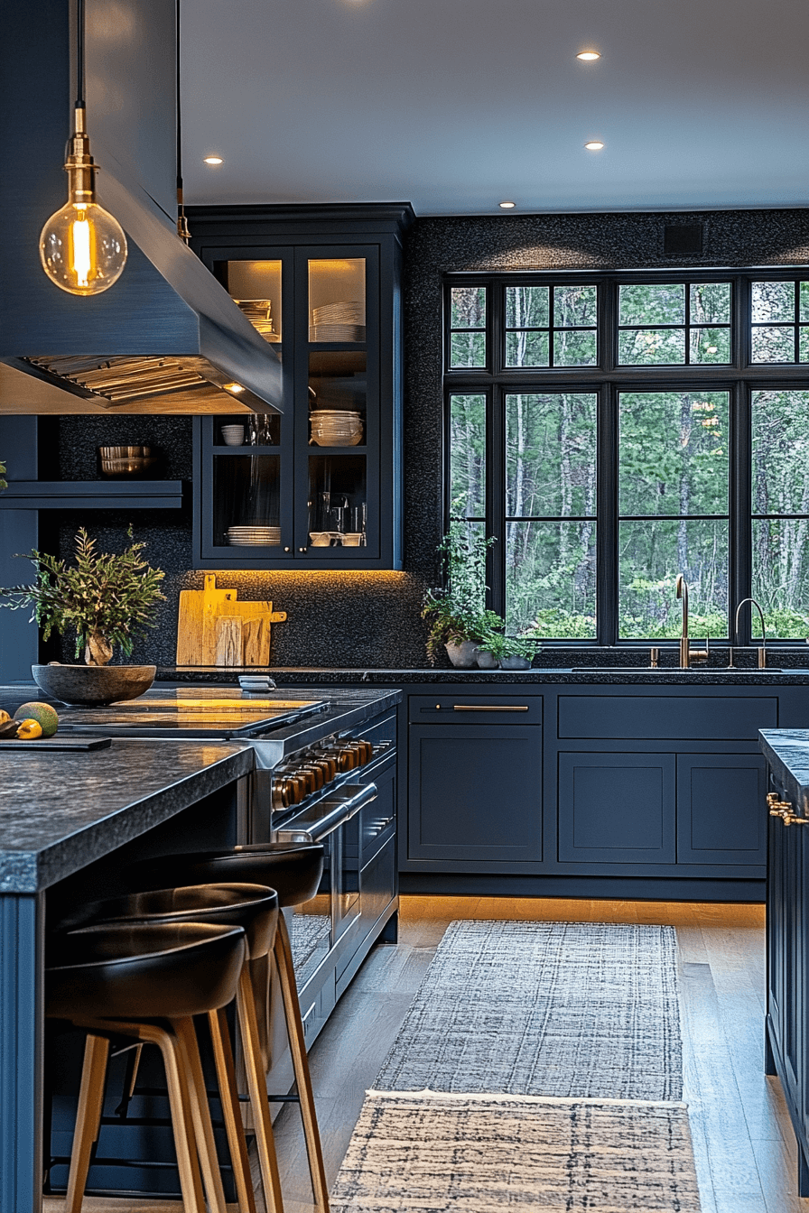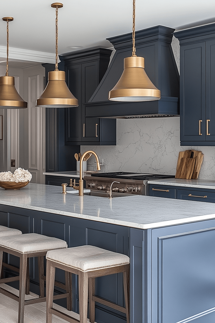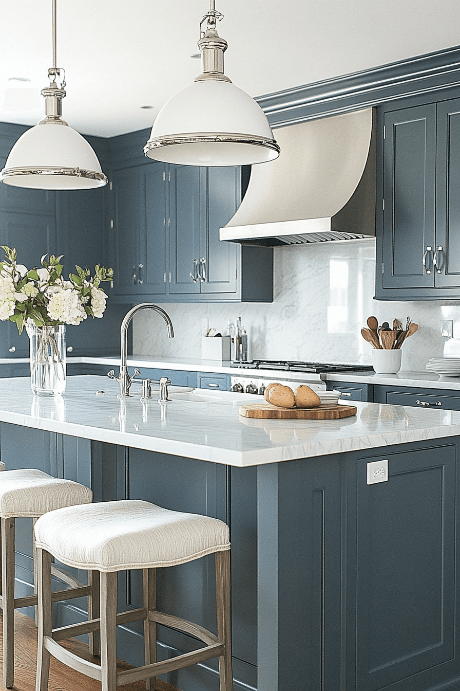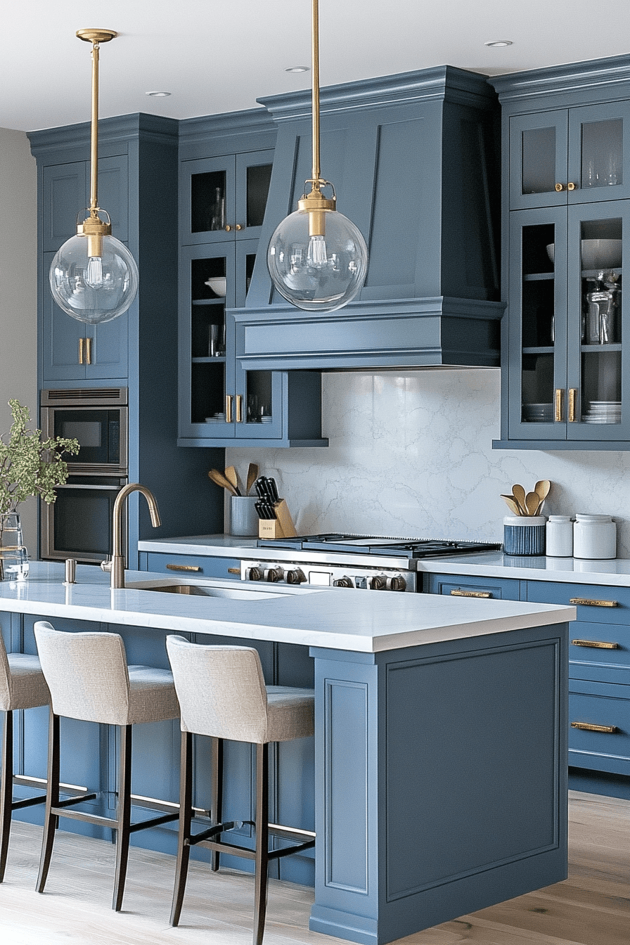 Understated luxury defines kitchens featuring slate blue kitchen cabinets with subtle richness. Soft metallic fixtures and creamy counters elevate the look. Layered lighting enhances depth without drama. Symmetry keeps everything refined. The elegance feels effortless.