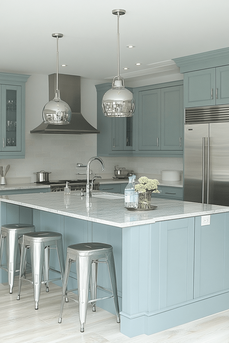 A relaxed, coastal-inspired kitchen comes to life when slate blue kitchen cabinets introduce a soft, breezy tone that feels fresh and welcoming. The blue-gray shade pairs beautifully with white quartz surfaces and brushed silver accents for a light, modern feel. This color choice adds dimension without overpowering open layouts. Pale wood details and light flooring help keep the atmosphere bright and effortless. The overall effect feels calm, clean, and endlessly inviting.