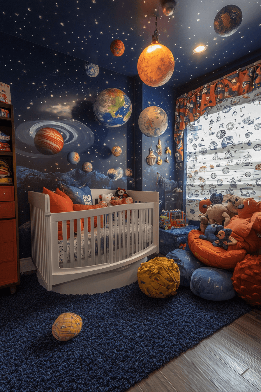 Cosmic-focused nursery designs center imagination while keeping baby comfort first. These space themed nursery ideas often feature space-inspired cribs paired with starry bedding and plush rugs. Neutral tones help balance bold cosmic details. Every element feels playful but soothing. The space invites curiosity and rest together.