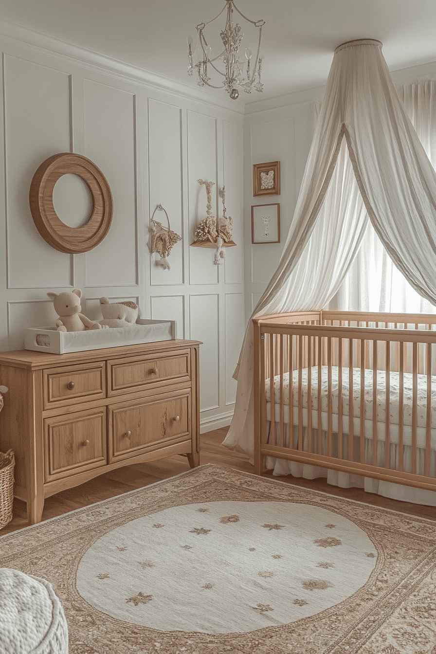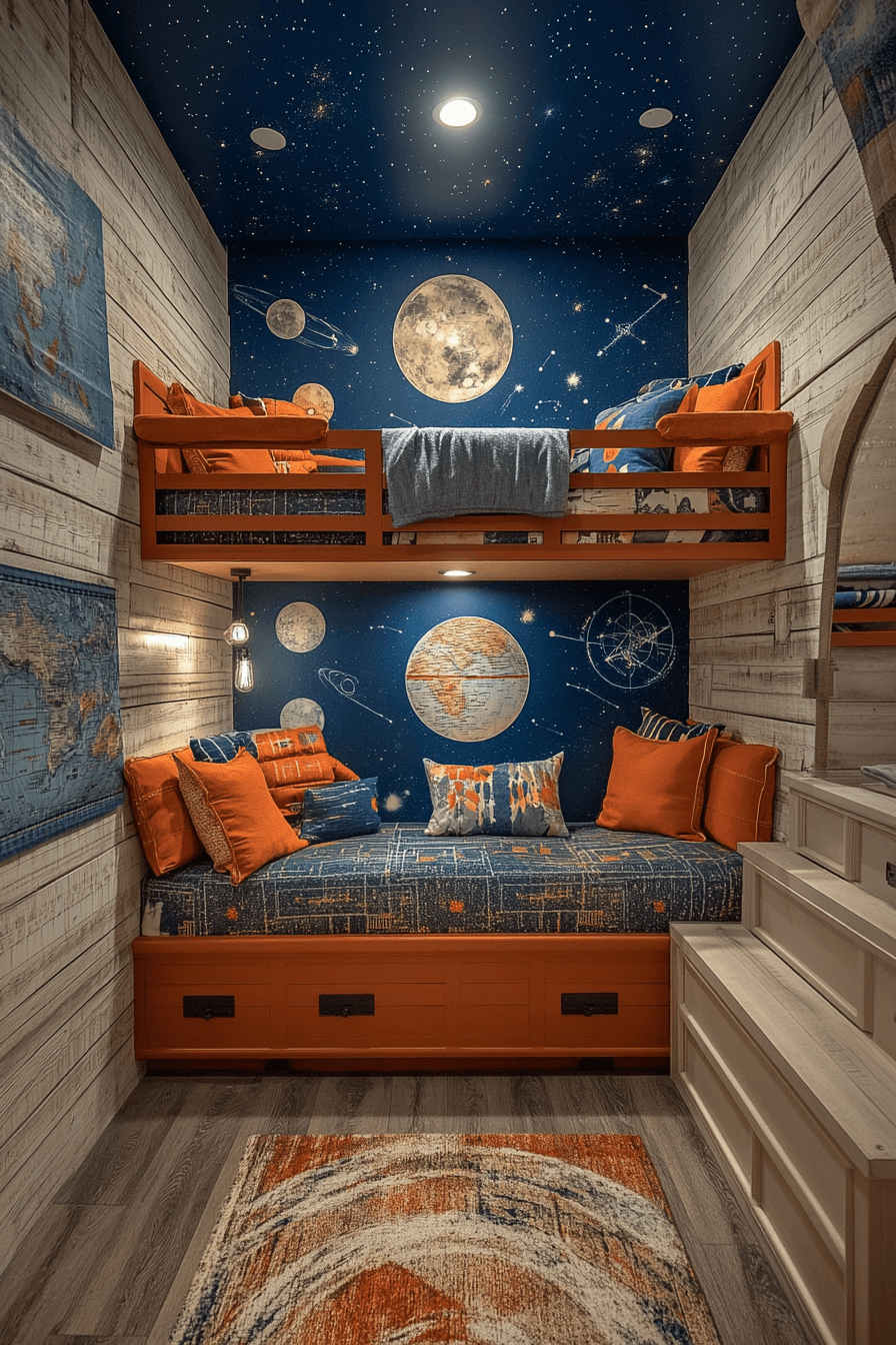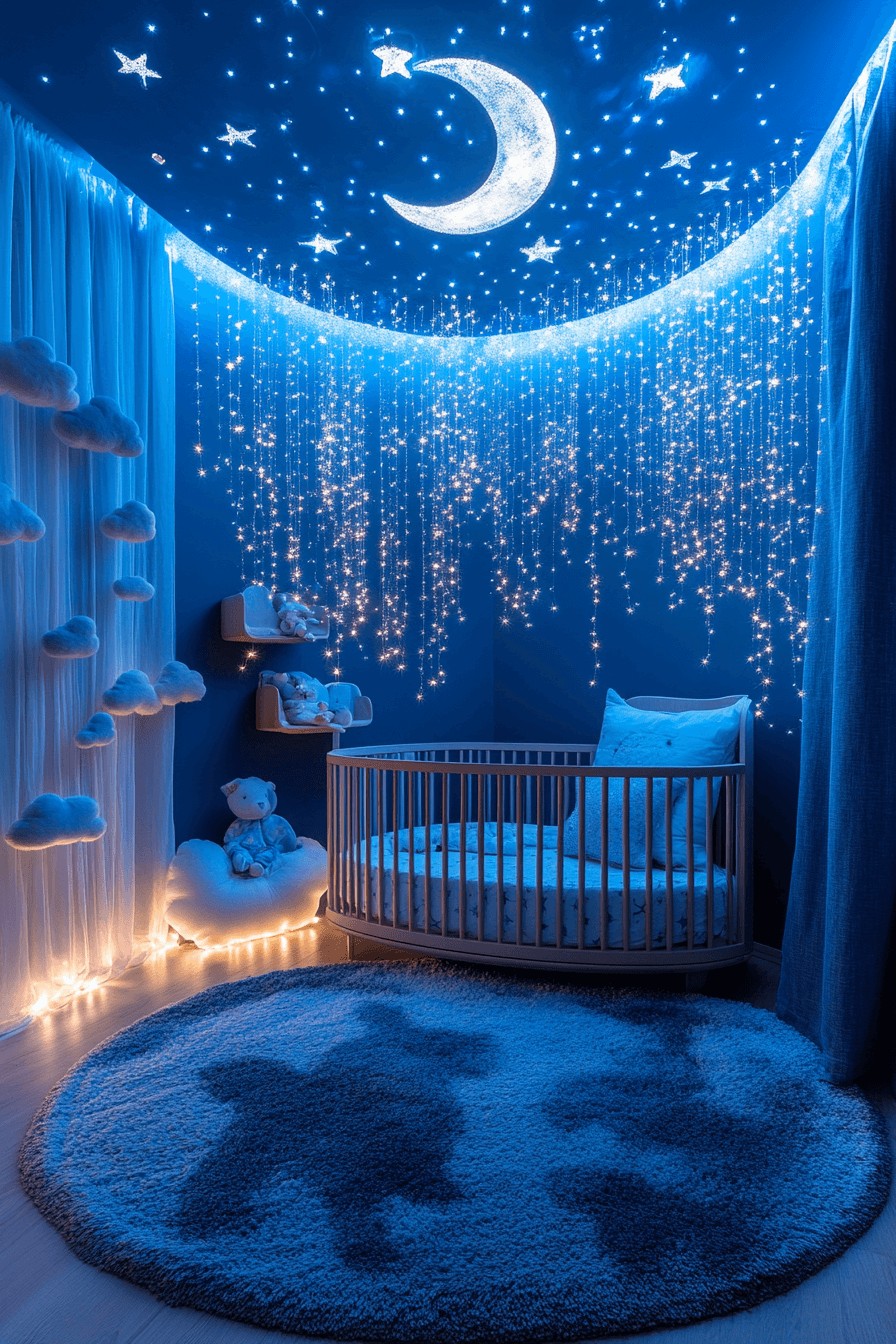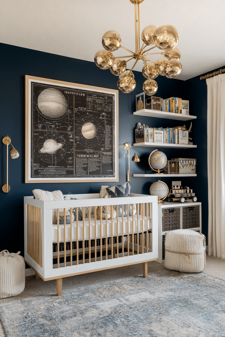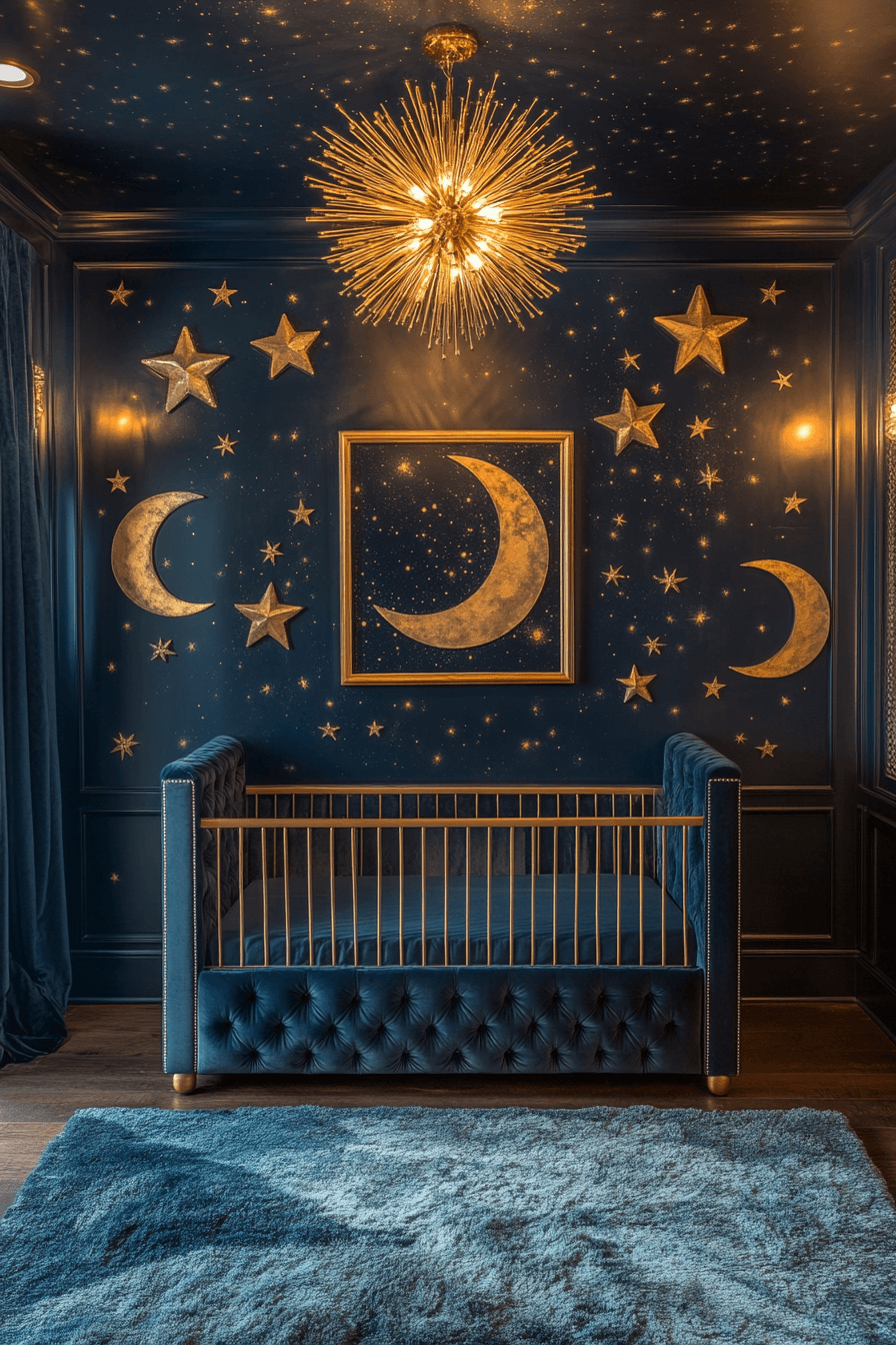Celestial-luxury nurseries combine imagination with sophistication. These space themed nursery ideas use rich tones, metallic accents, and layered fabrics. Soft lighting enhances warmth and depth. Celestial motifs remain subtle and refined. The room feels timeless and magical.