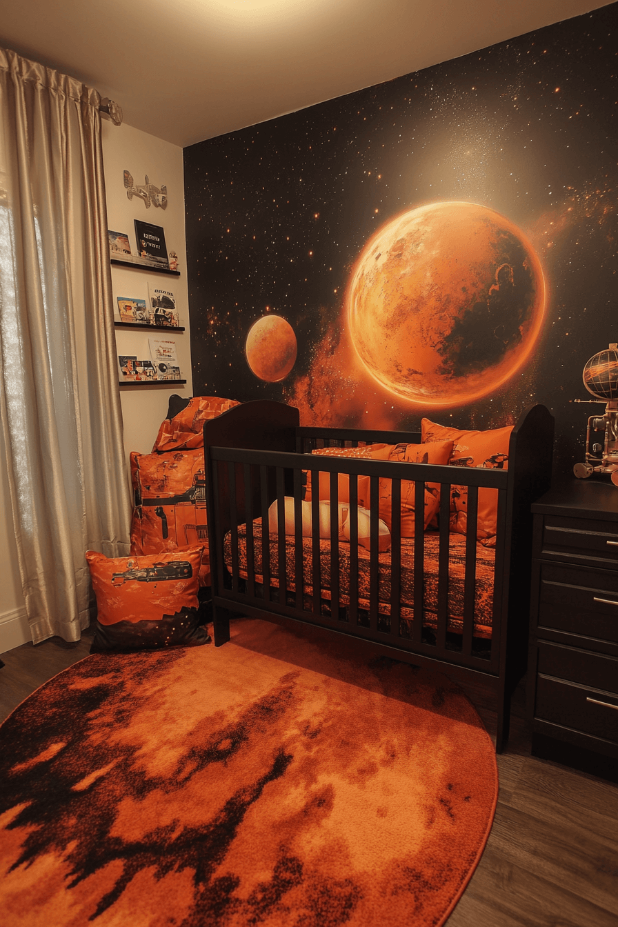 Mars-inspired nurseries introduce warmth and curiosity. These space themed nursery ideas feature rust tones, textured accents, and planet imagery. Neutral furniture balances bold color choices. Educational elements feel playful and natural. Energy stays grounded.