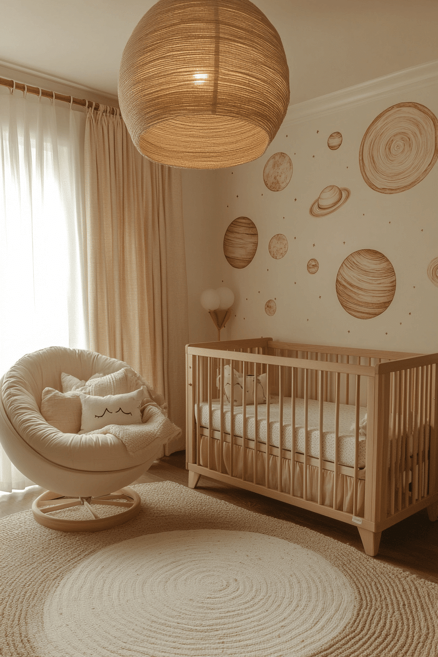Starlight-inspired nurseries use gentle sparkle to support sleep. These space themed nursery ideas incorporate constellation murals and warm string lights for nighttime calm. Furniture remains minimal to avoid visual clutter. Planet-shaped mobiles add charm without noise. The room feels peaceful and dreamy.