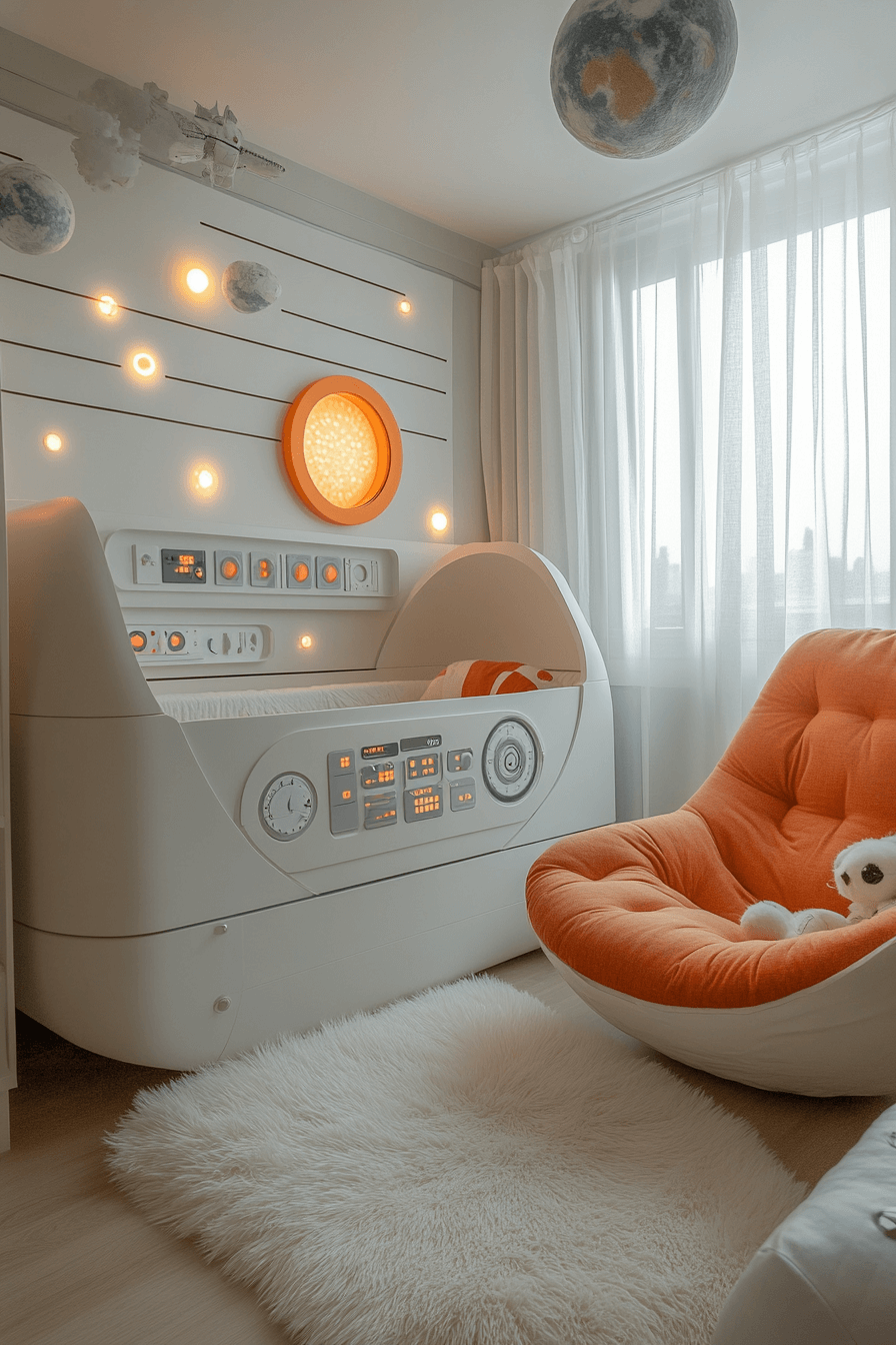 Capsule-style nurseries focus on comfort and safety. These space themed nursery ideas use rounded furniture, compact layouts, and soft finishes. Futuristic details remain baby-friendly. The room feels secure and stylish. Comfort leads every choice.