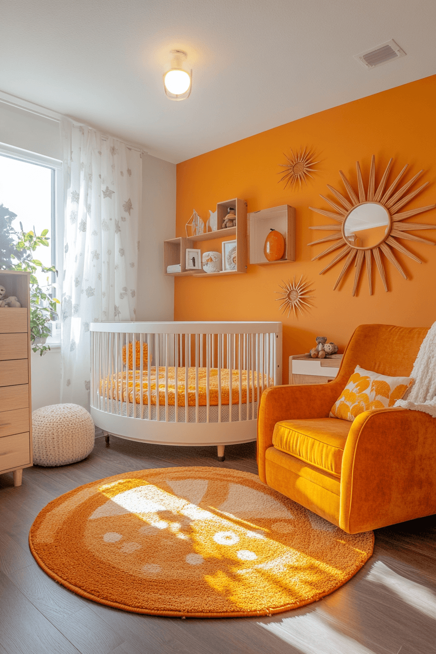Solar-inspired nurseries radiate warmth and joy. These space themed nursery ideas use sunny hues, gentle glow lighting, and natural textures. Brightness feels uplifting but balanced. The room feels cheerful and calm. Positivity fills the space.