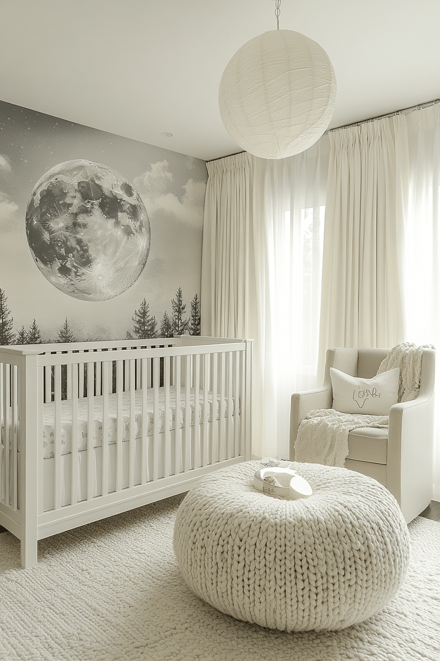 Moon-inspired nurseries focus on quiet beauty and simplicity. These space themed nursery ideas rely on soft grays, creamy whites, and lunar artwork. Rounded decor elements add comfort and flow. Gentle lighting mimics moonlight for nighttime ease. The atmosphere feels calm and reassuring.