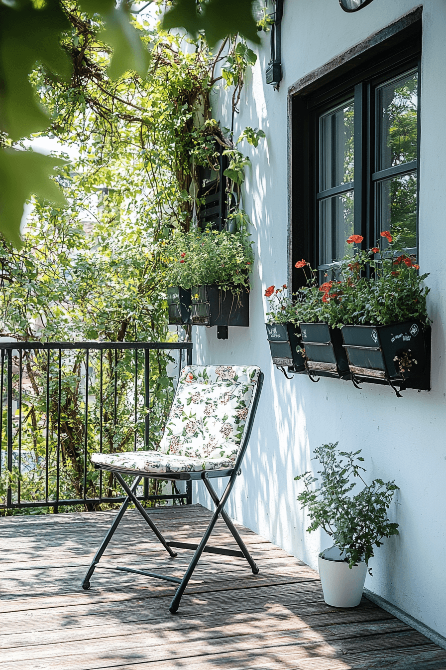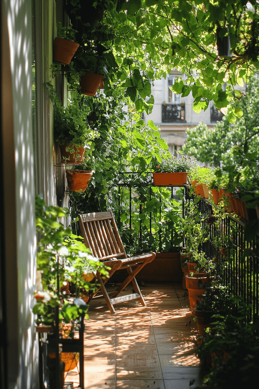 Focused on vertical space, a tiny balcony can feel lush without losing floor area. Hanging planters and wall-mounted pots add greenery upward. A slim chair fits comfortably below. The layout feels layered and dynamic. Greenery expands the space visually.