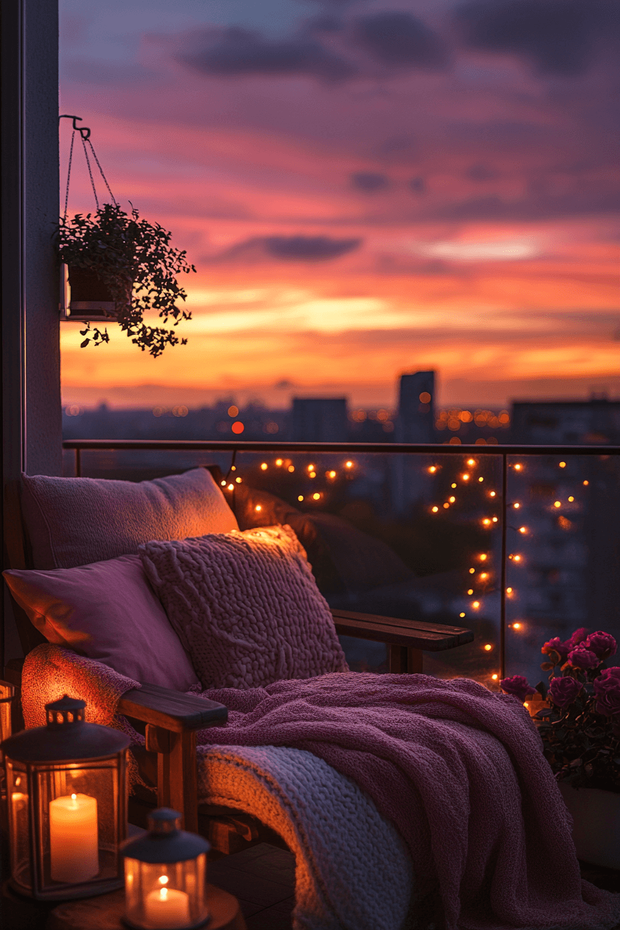 Crafted for evening relaxation, a tiny balcony becomes a cozy lounge. Soft seating invites unwinding. Lanterns enhance atmosphere. The night view becomes part of the experience. The space feels intimate.