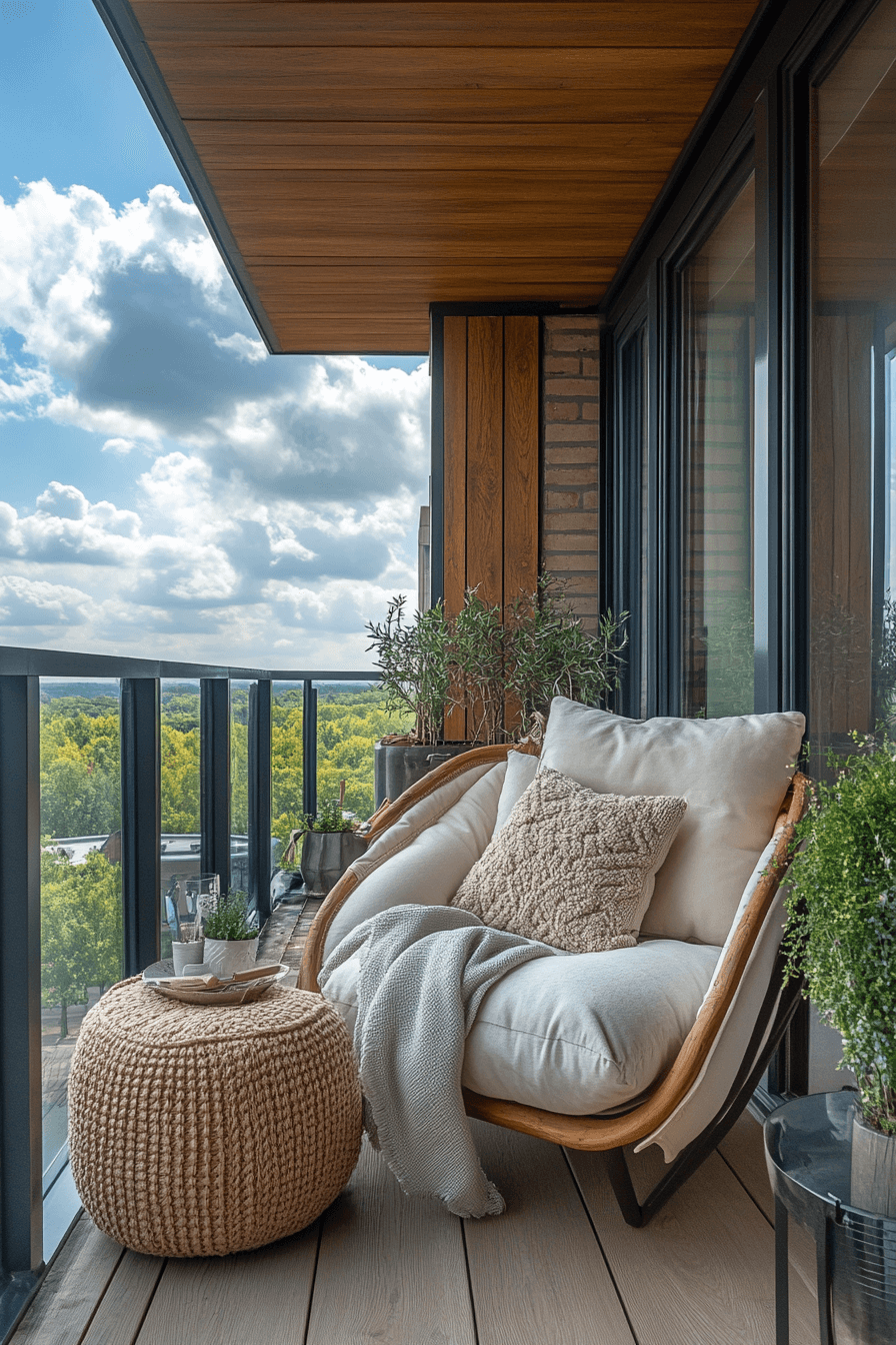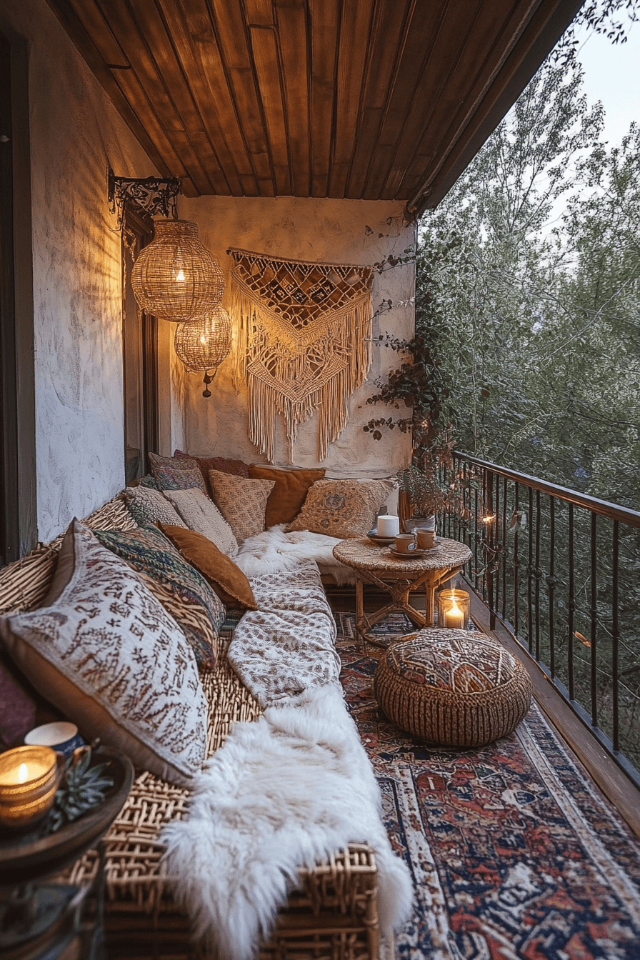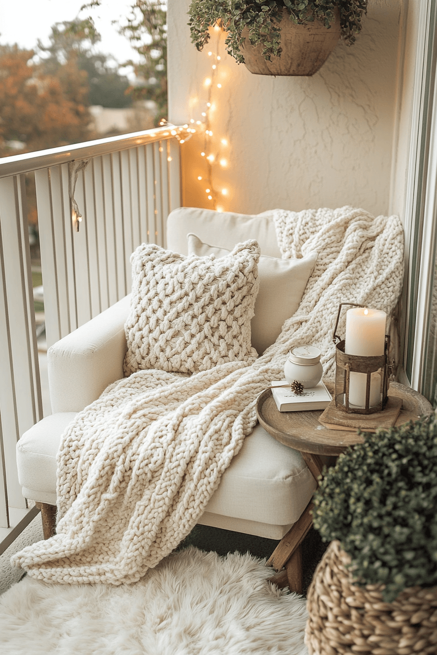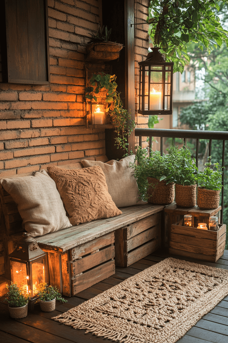 Surrounded by warm textures, a tiny balcony can feel surprisingly cozy. Woven rugs, knit throws, and soft cushions invite you to linger longer. Low seating keeps the space grounded and relaxed. Lanterns add a gentle glow after sunset. The mood is intimate and inviting.