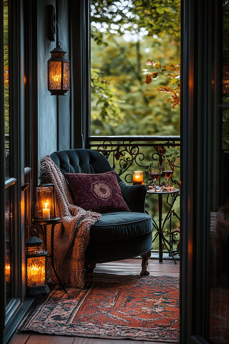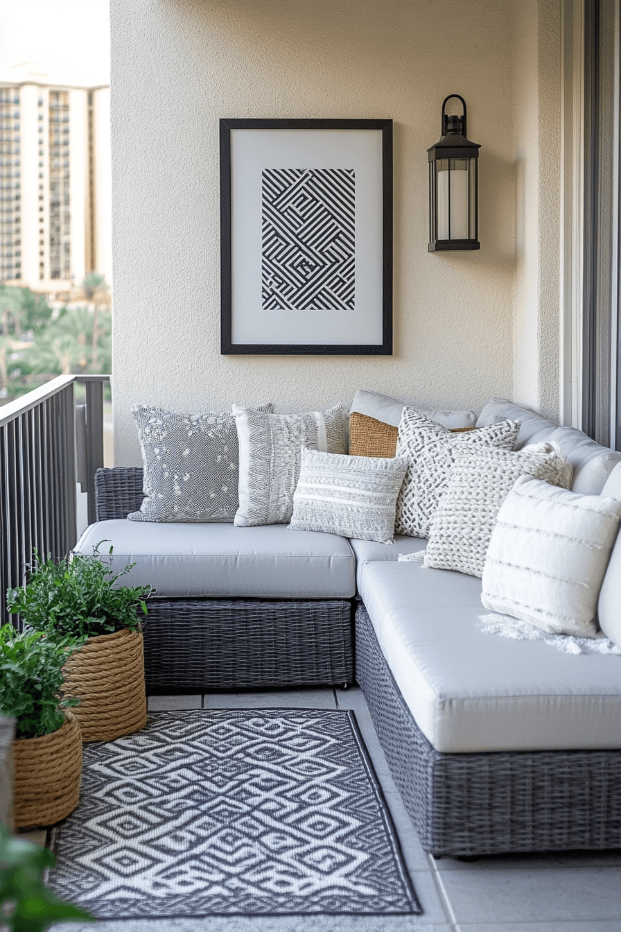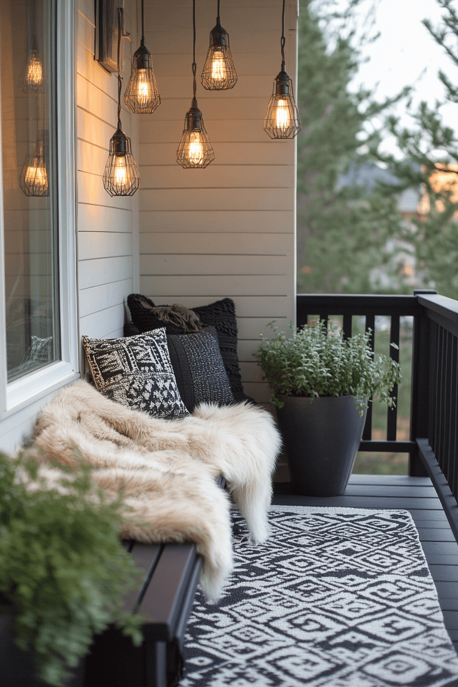 Surrounded by warm textures, a tiny balcony can feel surprisingly cozy. Woven rugs, knit throws, and soft cushions invite you to linger longer. Low seating keeps the space grounded and relaxed. Lanterns add a gentle glow after sunset. The mood is intimate and inviting.