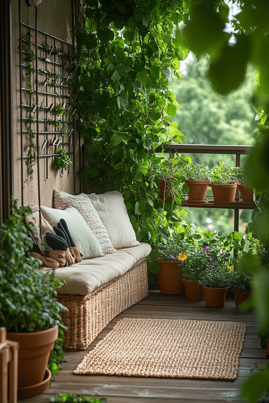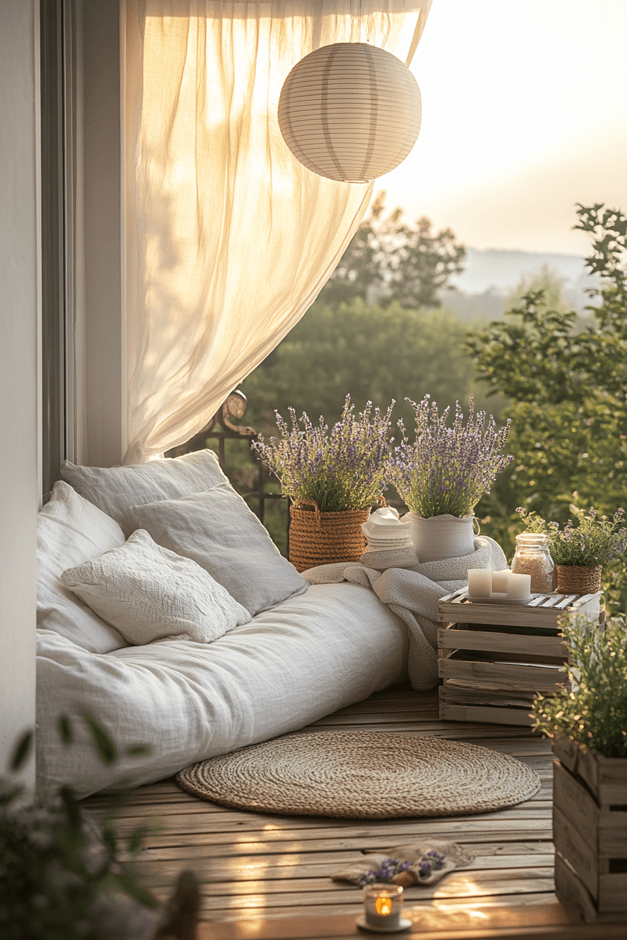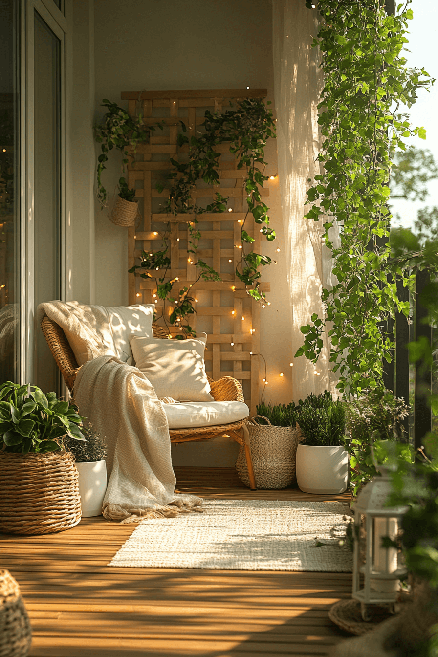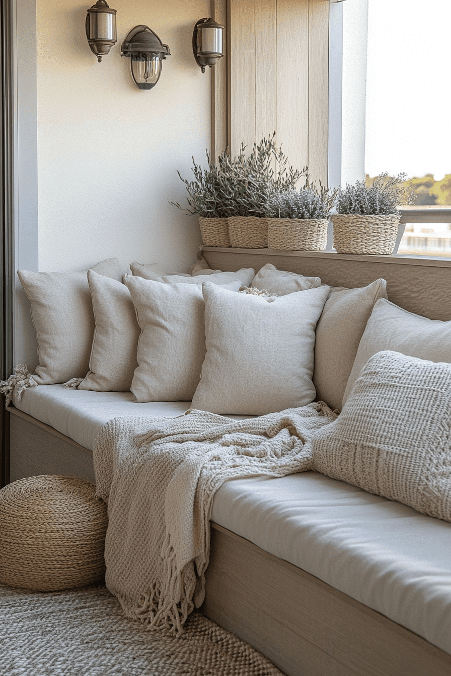Surrounded by warm textures, a tiny balcony can feel surprisingly cozy. Woven rugs, knit throws, and soft cushions invite you to linger longer. Low seating keeps the space grounded and relaxed. Lanterns add a gentle glow after sunset. The mood is intimate and inviting.