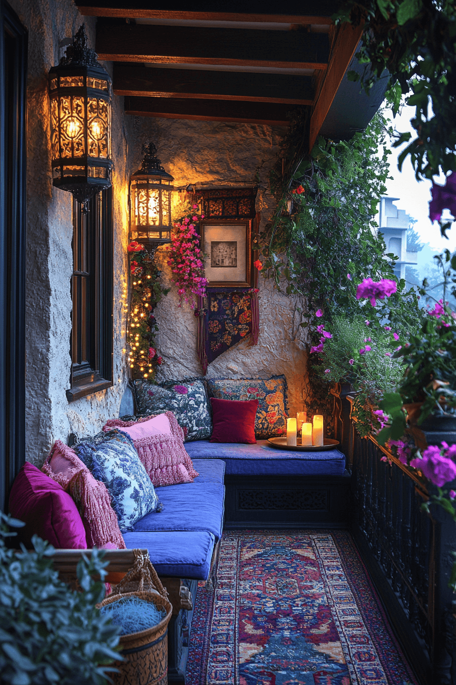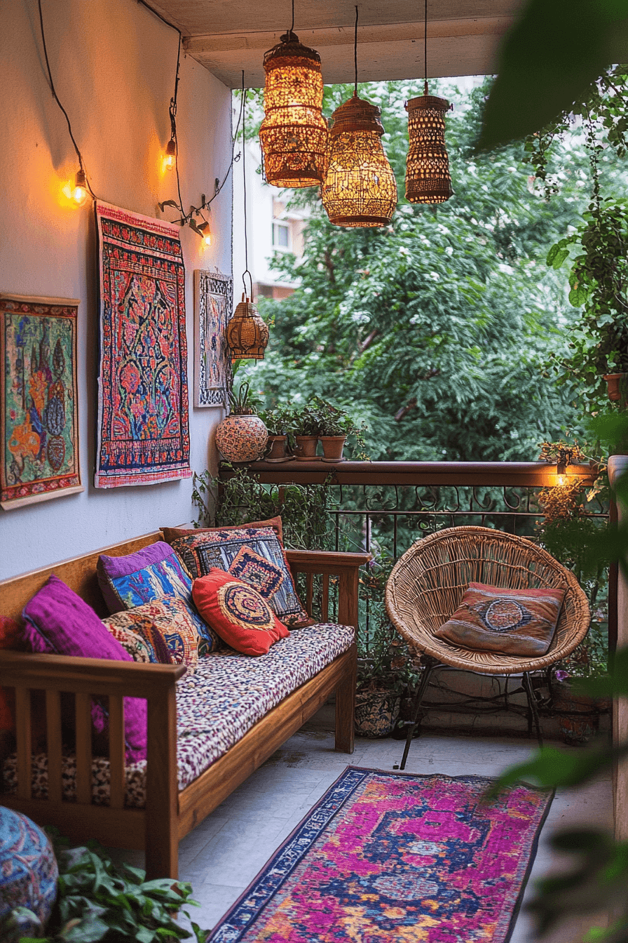 Inspired by bohemian flair, a tiny balcony can feel warm and expressive. Layered cushions and textured fabrics add charm. Lanterns and plants enhance the relaxed mood. Nothing feels overly styled. The space feels personal and inviting.