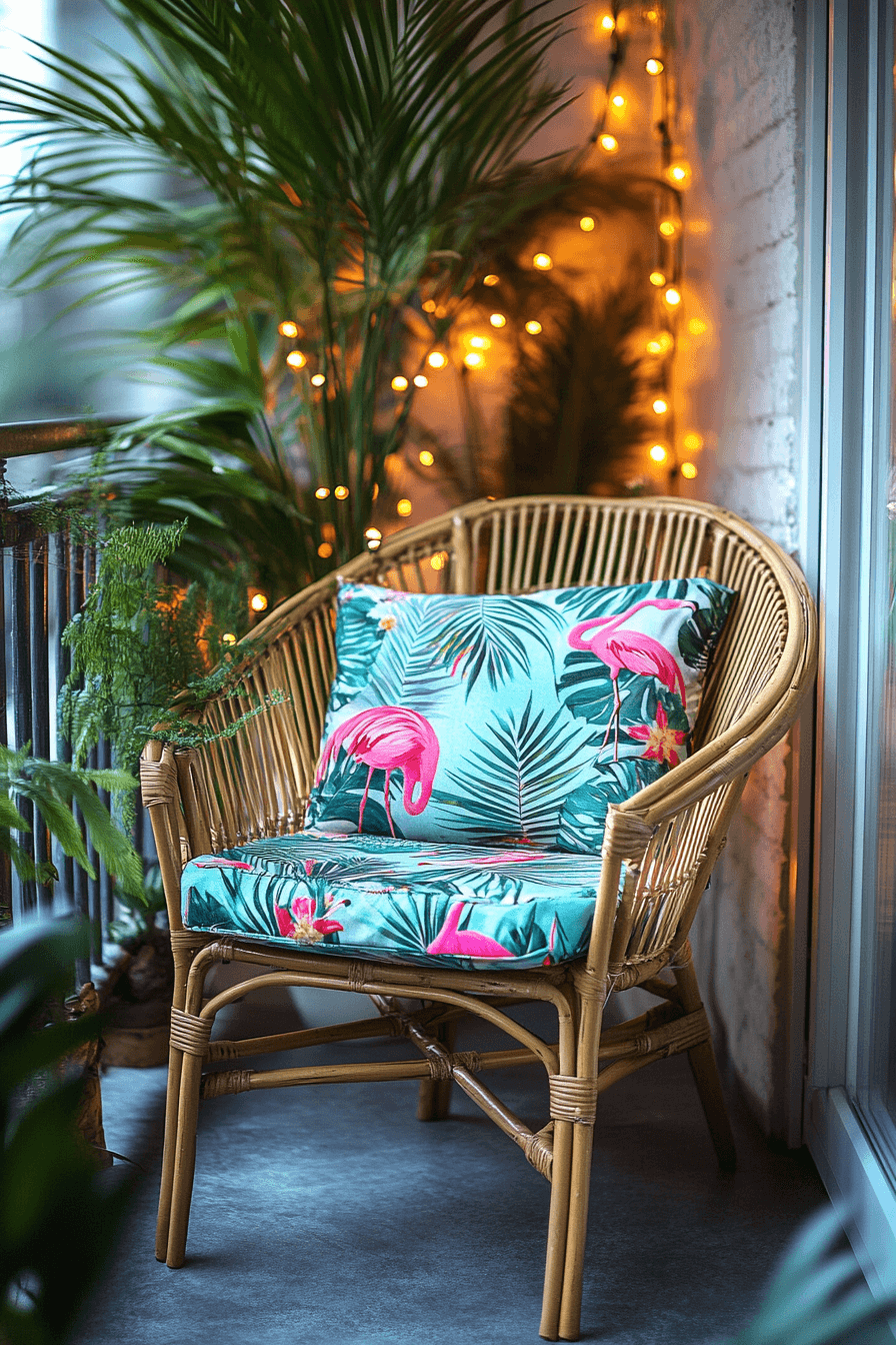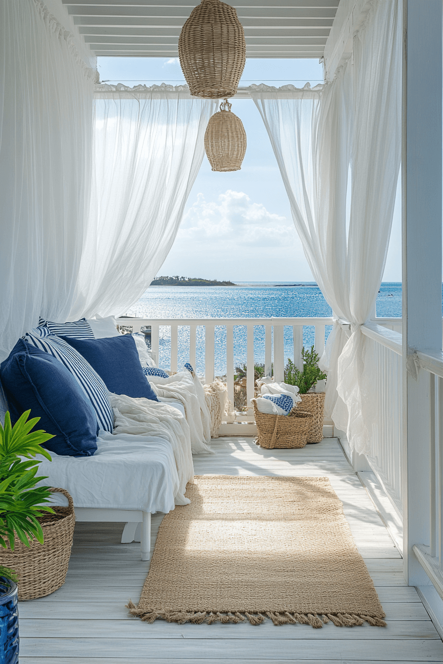 Rooted in coastal influence, a tiny balcony can feel breezy and relaxed. Blue-and-white textiles echo seaside charm. Natural materials enhance the look. Light seating keeps it casual. The vibe feels vacation-ready.