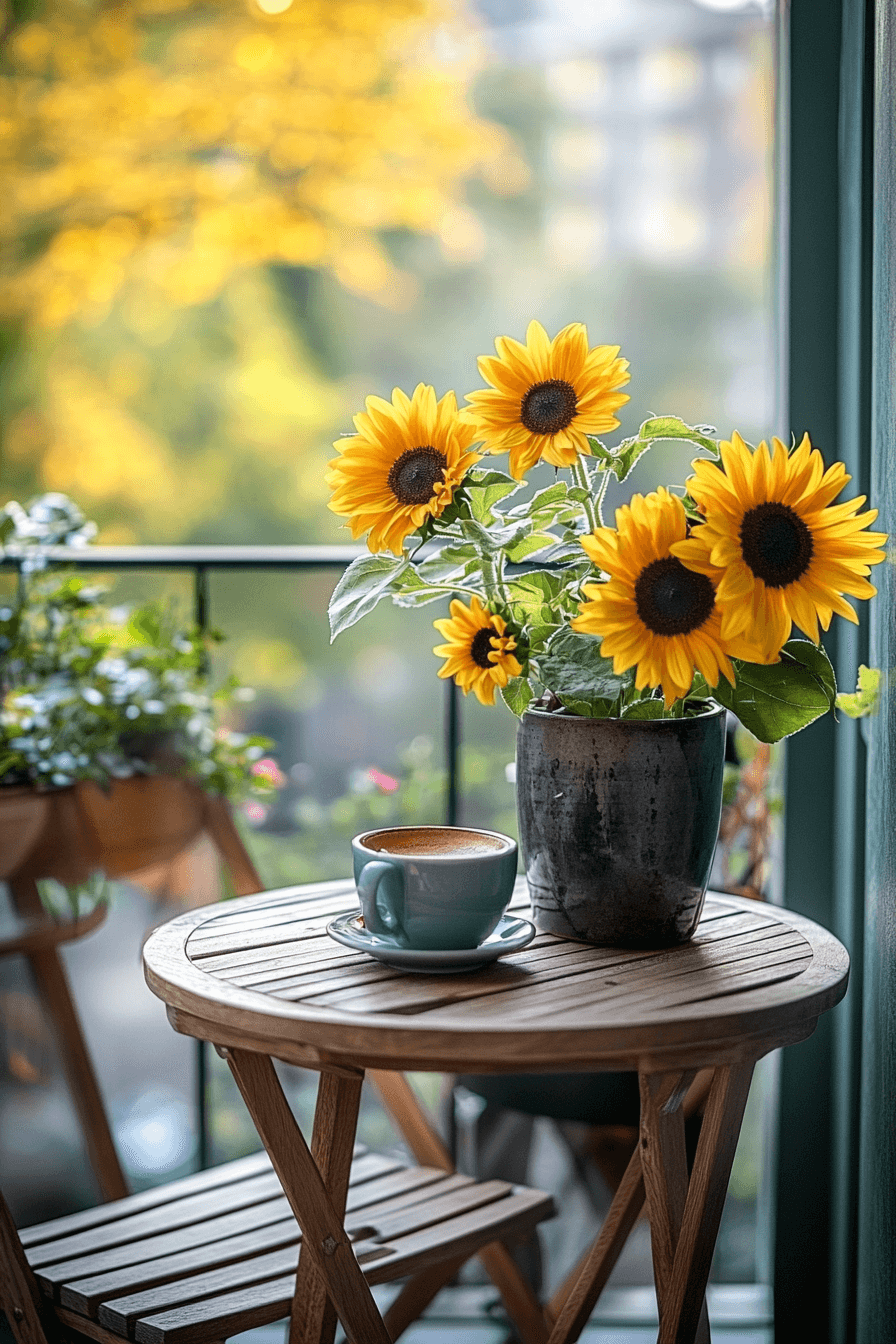 Styled for quiet mornings, a tiny balcony becomes a daily ritual spot. A petite table and chair set the scene. Cheerful cushions energize the space. Compact pieces maintain openness. It’s perfect for coffee or journaling.