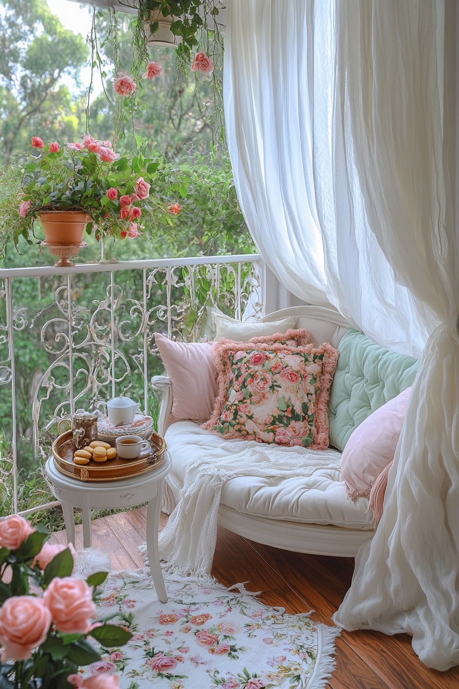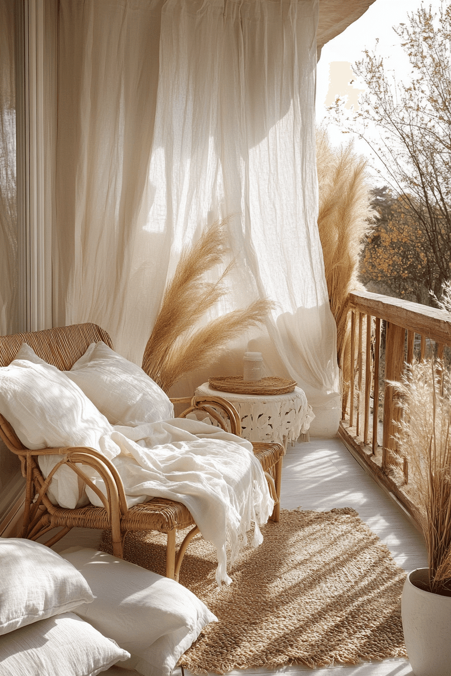 Framed by airy fabrics, a tiny balcony gains privacy without feeling closed in. Sheer curtains soften sunlight and movement. Compact seating fits neatly along the railing. Light-colored textiles keep the space bright. The atmosphere feels serene and breezy.