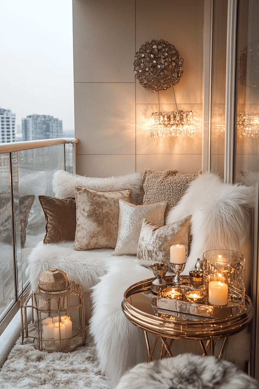 Brightened by reflective accents, a tiny balcony appears more spacious. Glass tables or metallic planters bounce light. Neutral seating keeps the look balanced. Decorative lighting adds polish. The result feels open and stylish.