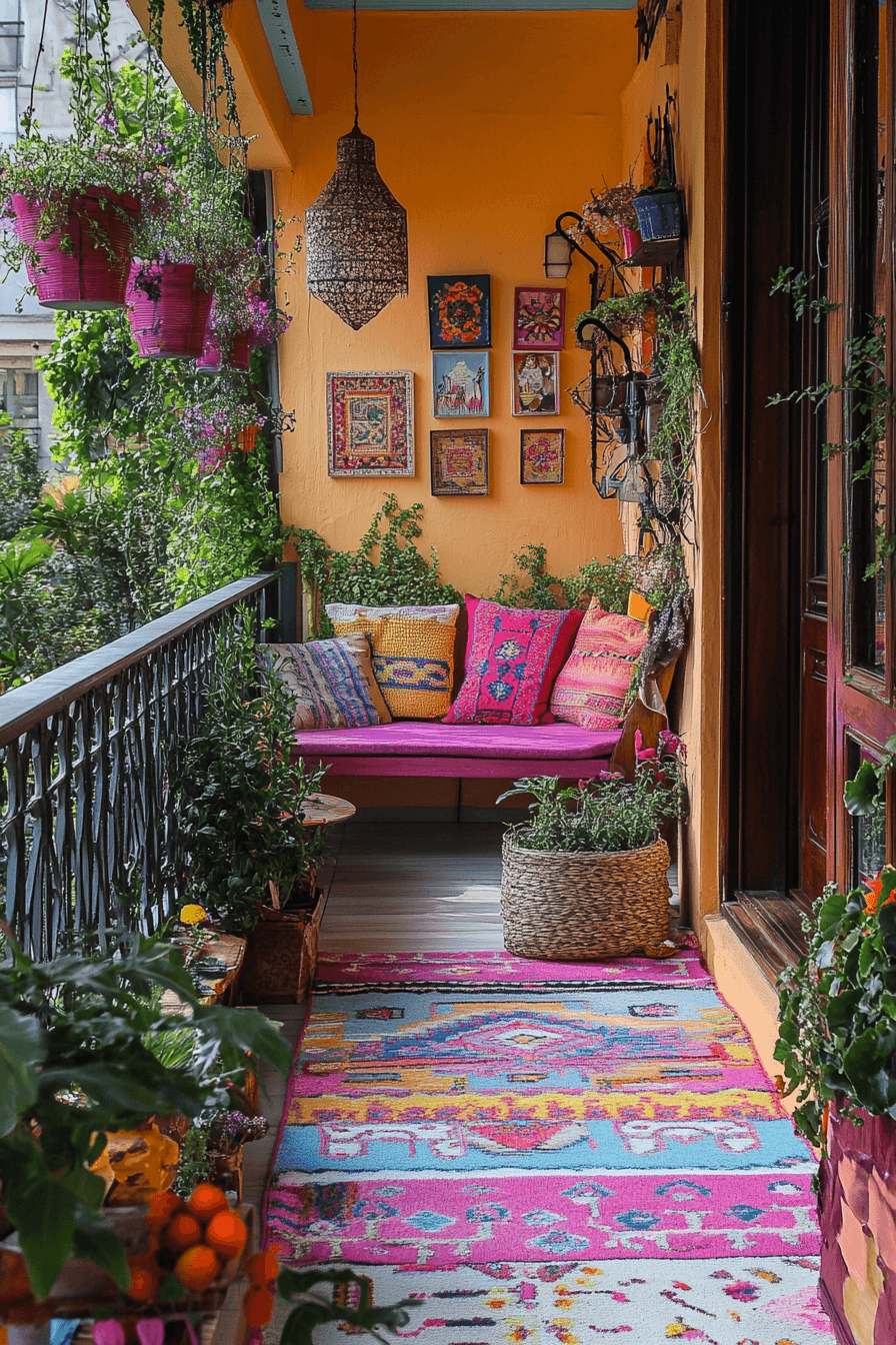 Powered by bold color, a tiny balcony becomes energetic and joyful. Vibrant cushions and accessories add personality. Simple furniture keeps balance. Color lifts the mood instantly. The space feels alive.
