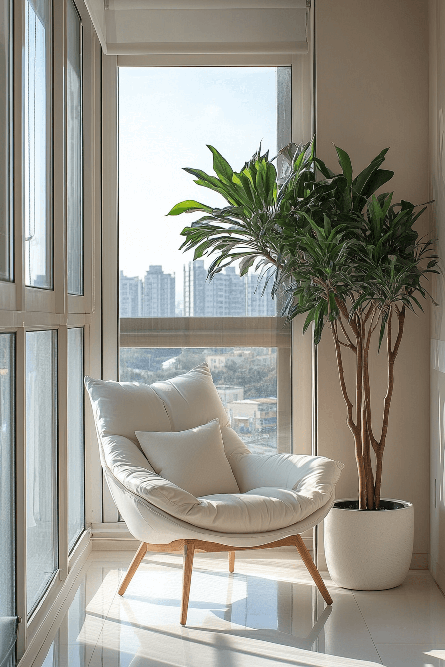 Anchored by a focal piece, a tiny balcony feels styled and complete. A standout chair or planter draws the eye. Supporting décor stays minimal. The space feels curated. Visual interest stays controlled.