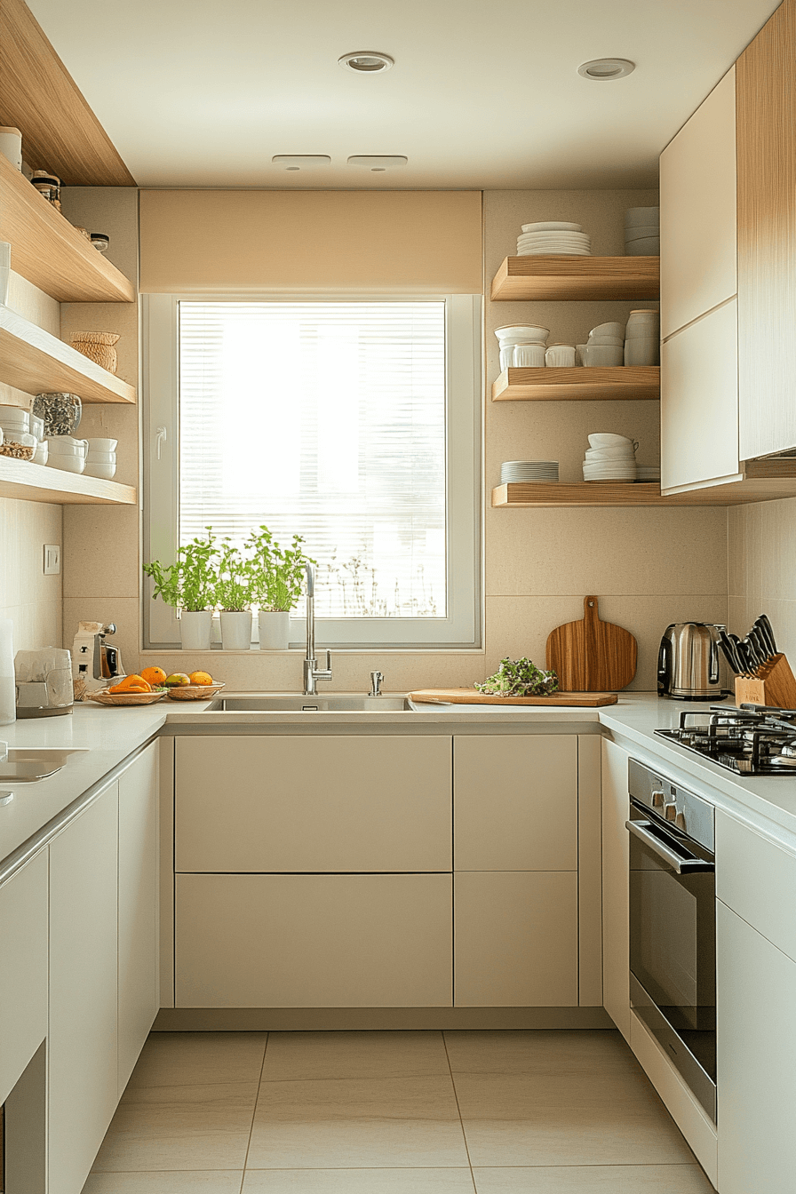 Gentle color layering allows a tiny cottage kitchen to feel calm, welcoming, and visually open. Soft cream and beige hues reflect light and prevent the space from feeling crowded. These tones create a timeless backdrop that highlights textures like wood or ceramic tile. The neutral palette keeps the room feeling balanced and serene. Everything feels intentionally simple.