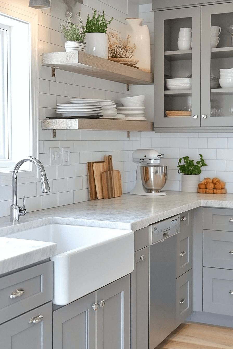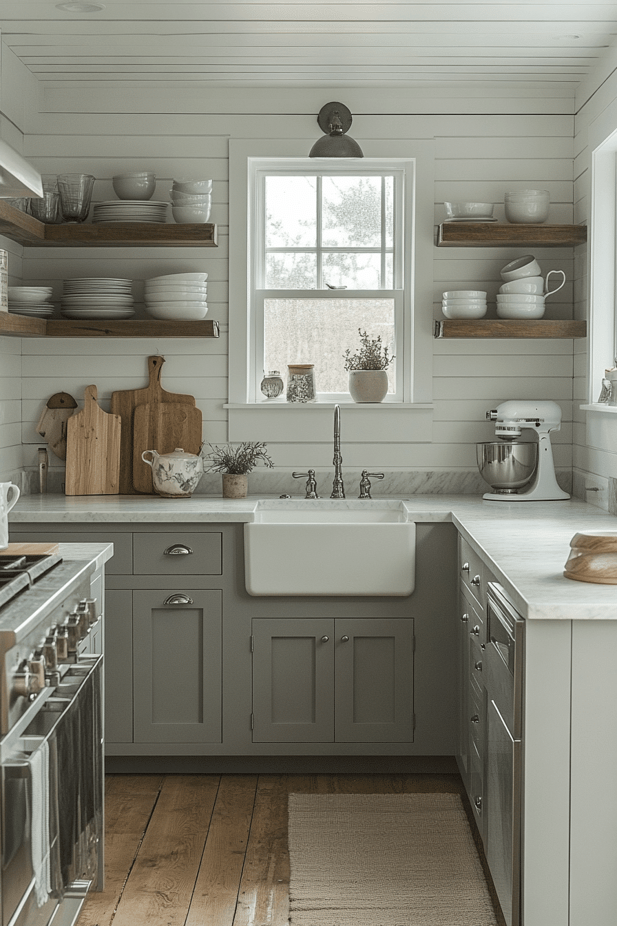 Cool light gray shades refresh a tiny cottage kitchen with airy balance. Cloud gray offers subtle color without weight. It pairs nicely with pale wood and metal accents. The kitchen feels open and peaceful. It’s clean and calming.