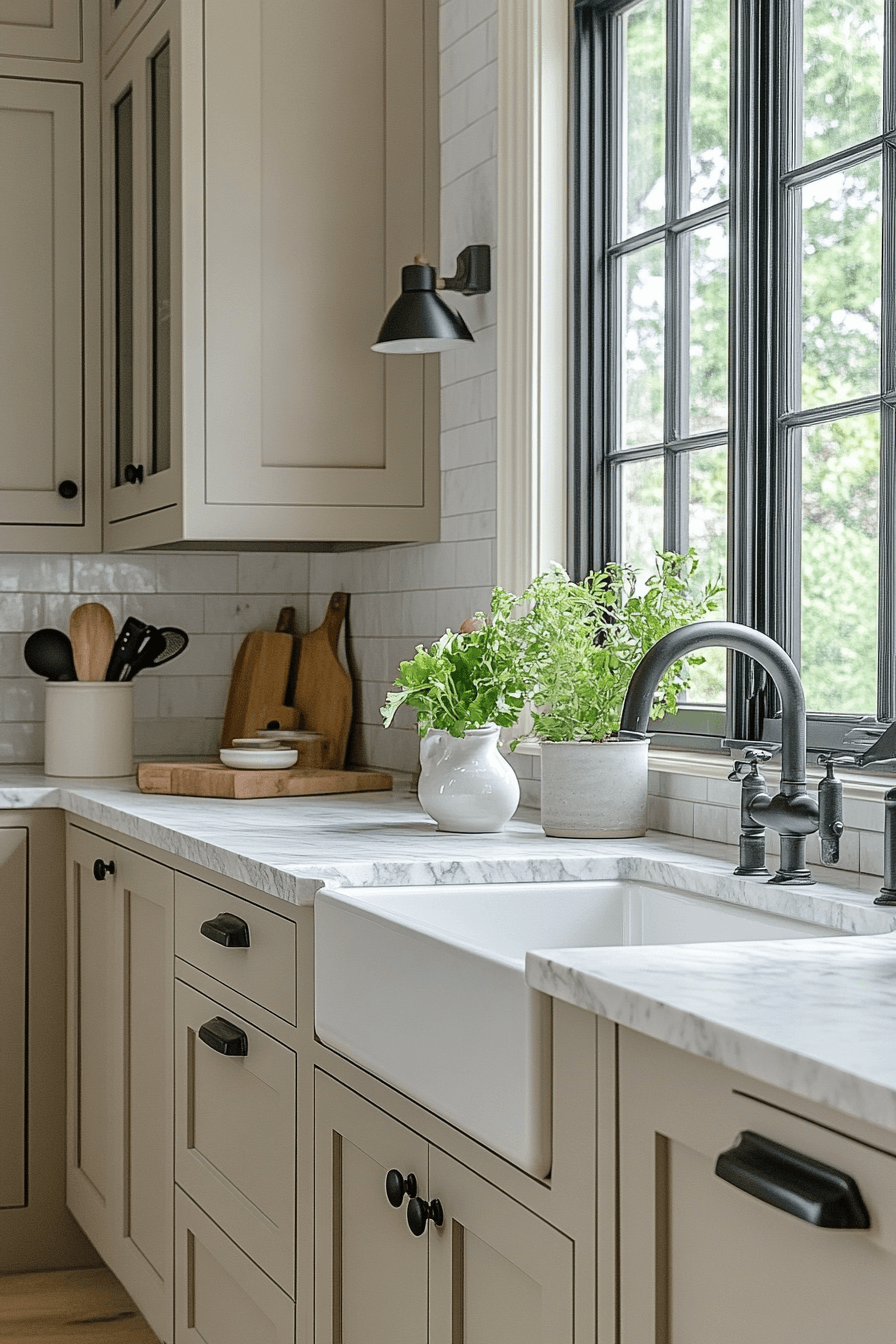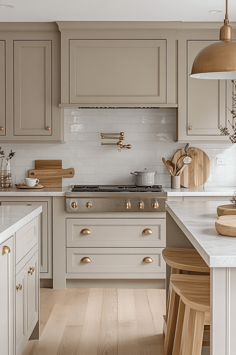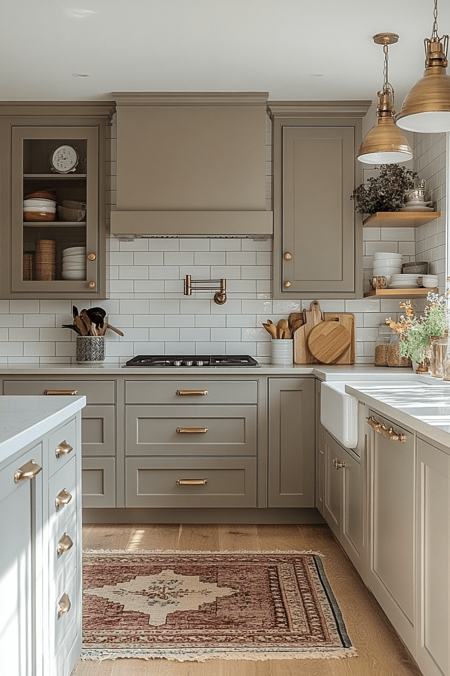 Balanced neutrals help a tiny cottage kitchen feel polished and cohesive. Greige tones softly merge gray and beige for effortless harmony. This shade works beautifully on cabinets or walls. It complements nearly every hardware finish. The space feels calm and refined.