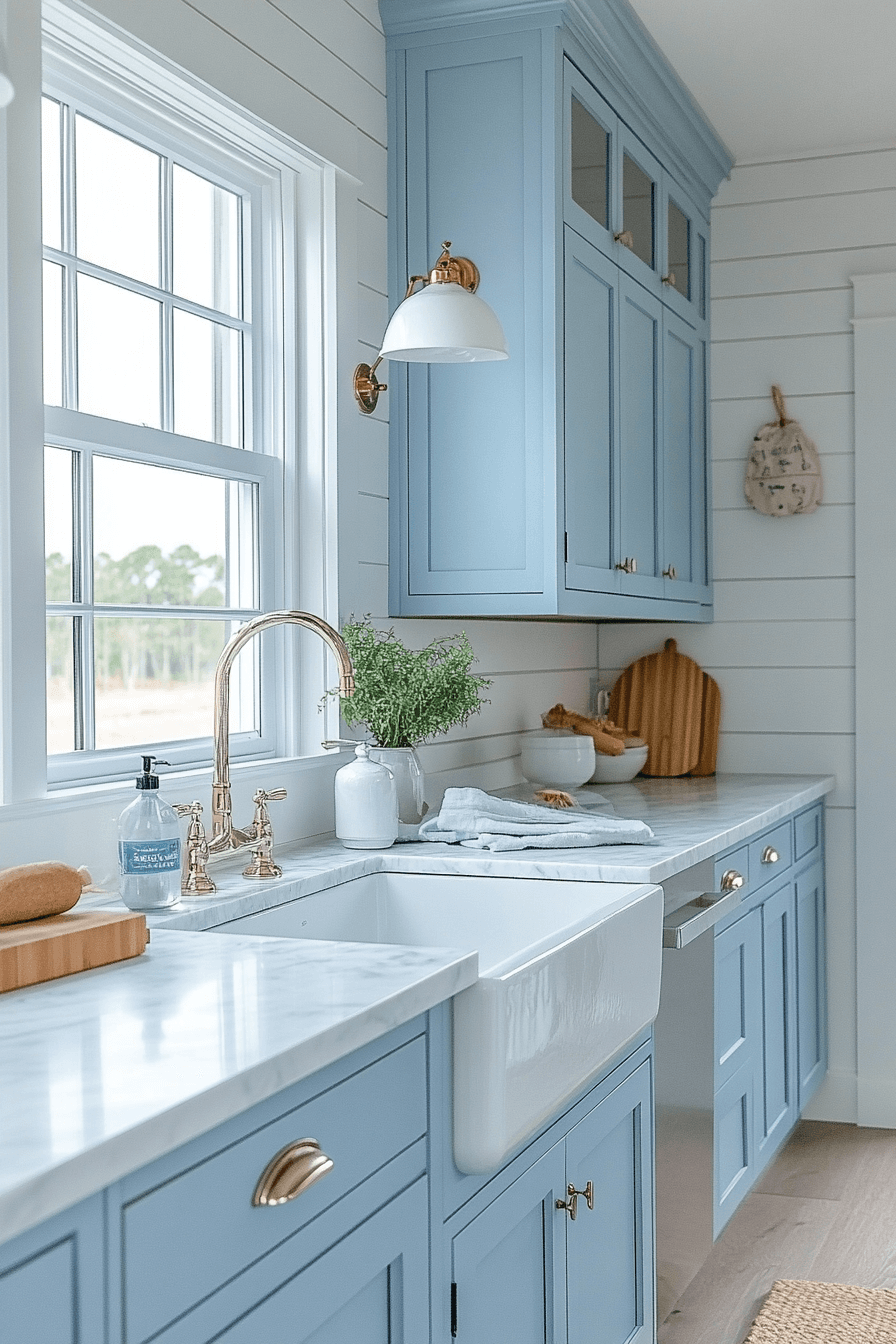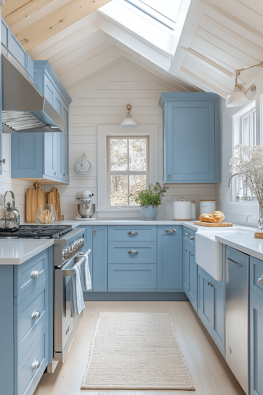 Fresh sky-inspired color opens up a tiny cottage kitchen with uplifting energy. Soft blue tones brighten the space without overwhelming it. When paired with white, the room feels airy and cheerful. Sky blue keeps things light and relaxed. The result feels refreshing.