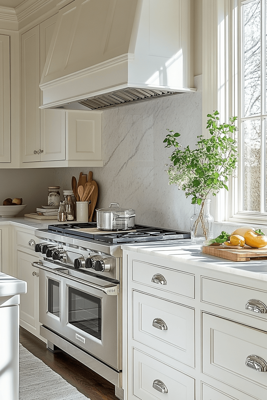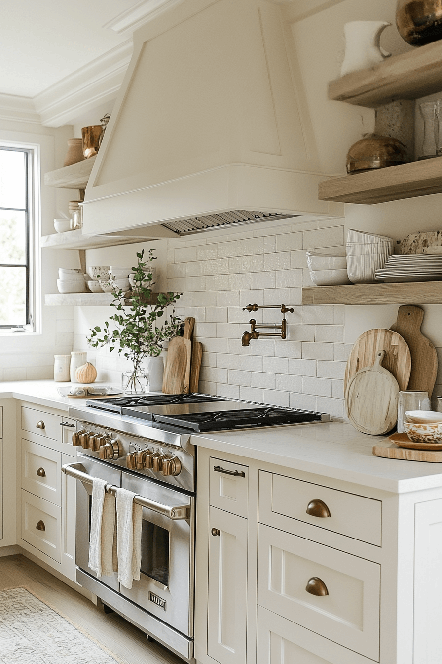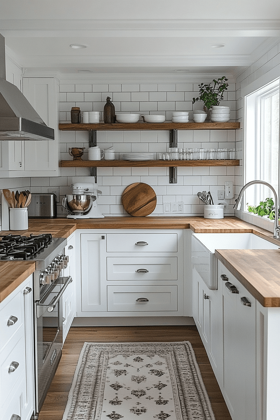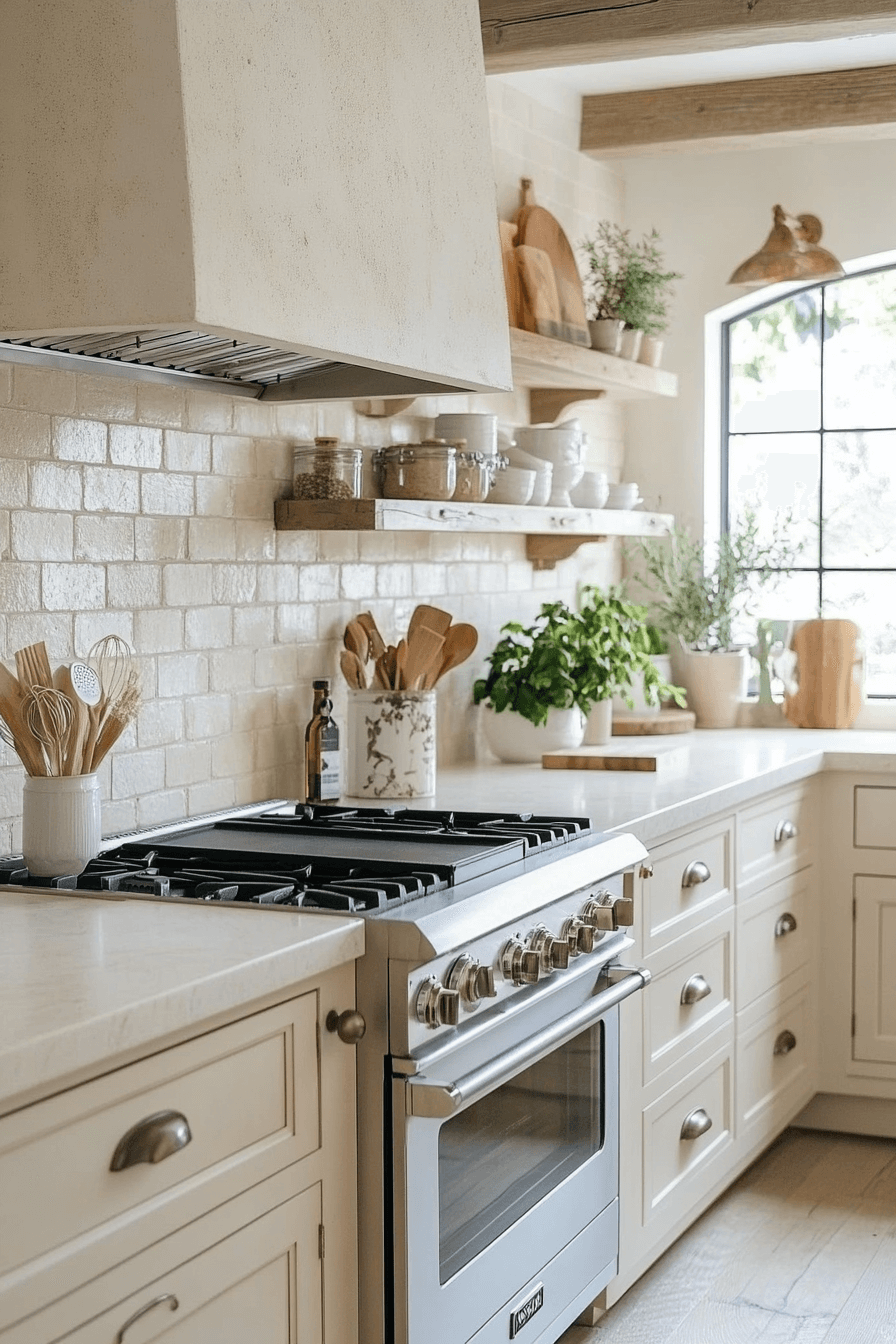 Softened whites bring elegance to a tiny cottage kitchen without harsh contrast. Off-white tones keep the space bright while feeling warm. They blend beautifully with wood, tile, and stone. The kitchen feels polished yet welcoming. It’s versatile and timeless.