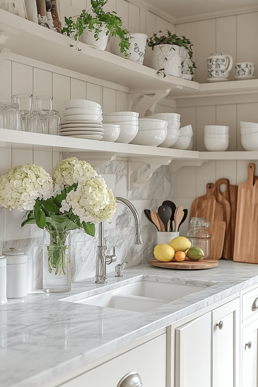 Clean brightness elevates a tiny cottage kitchen styled with crisp white finishes. White surfaces reflect light and visually expand the room. They also highlight textures like beadboard or stone. The look stays classic and adaptable. The kitchen feels open and welcoming.