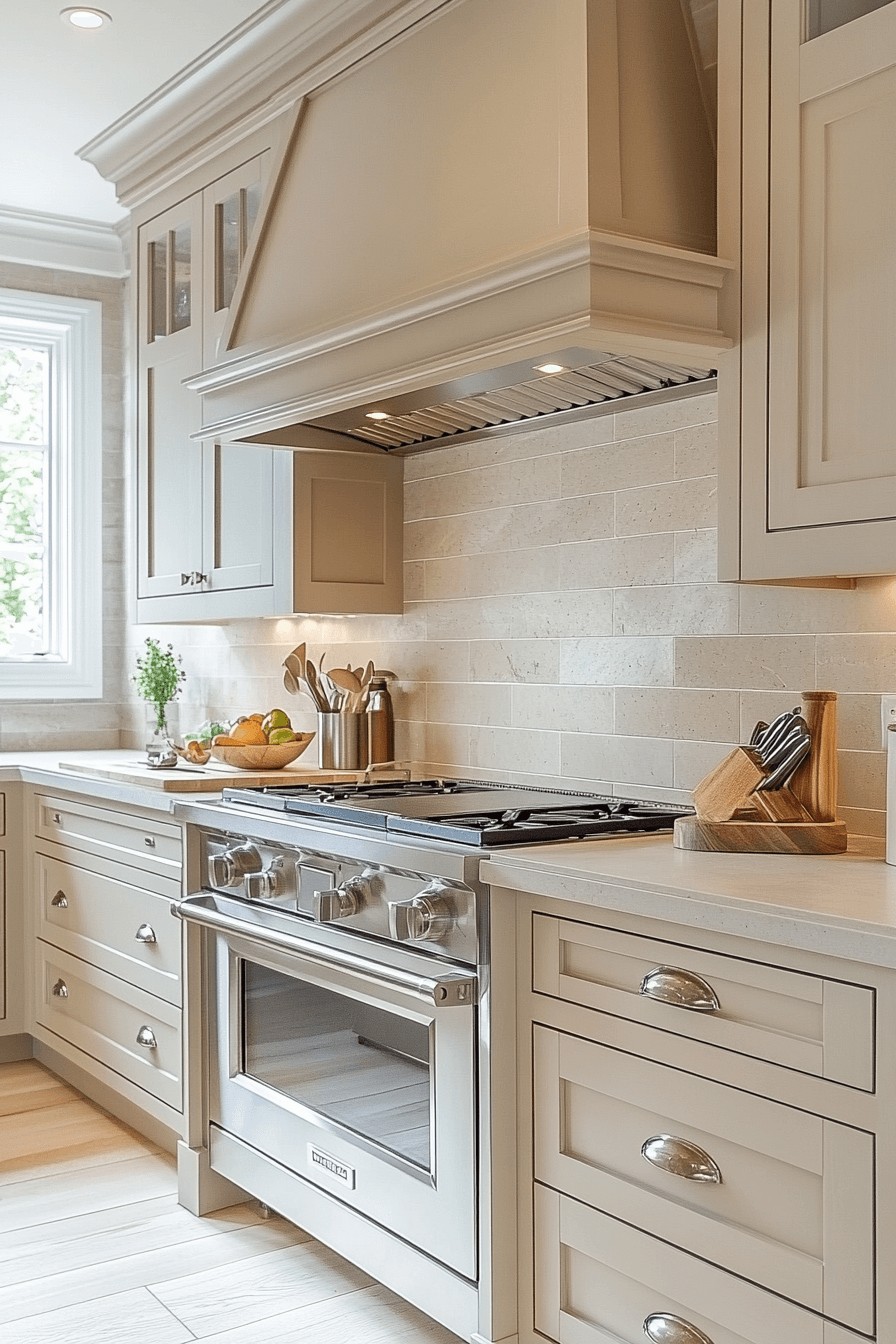 Clean stone-beige shades calm a tiny cottage kitchen with neutral sophistication. This tone offers balance without distraction. It works well with both warm and cool accents. Stone beige expands visual space gently. The look stays timeless.