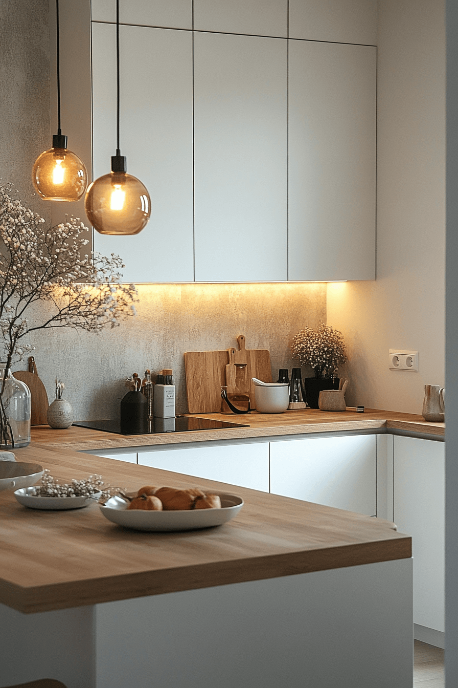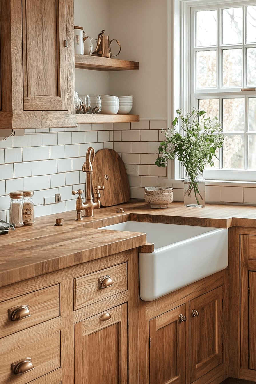 Sunlit oak textures add charm to a tiny cottage kitchen with natural warmth. Light oak reflects brightness while introducing subtle grain. It pairs beautifully with neutral cabinetry. The look stays clean and open. Oak brings balance and coziness.