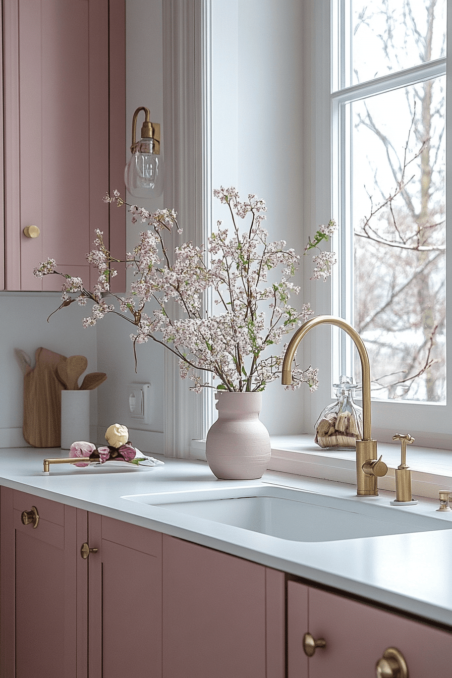 Muted blush tones bring gentle personality into a tiny cottage kitchen. Dusty rose adds warmth without overpowering. It works beautifully with off-white and gray finishes. The mood feels soft and romantic. The space remains refined.
