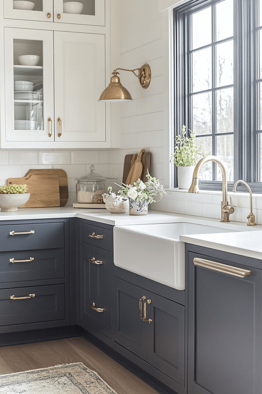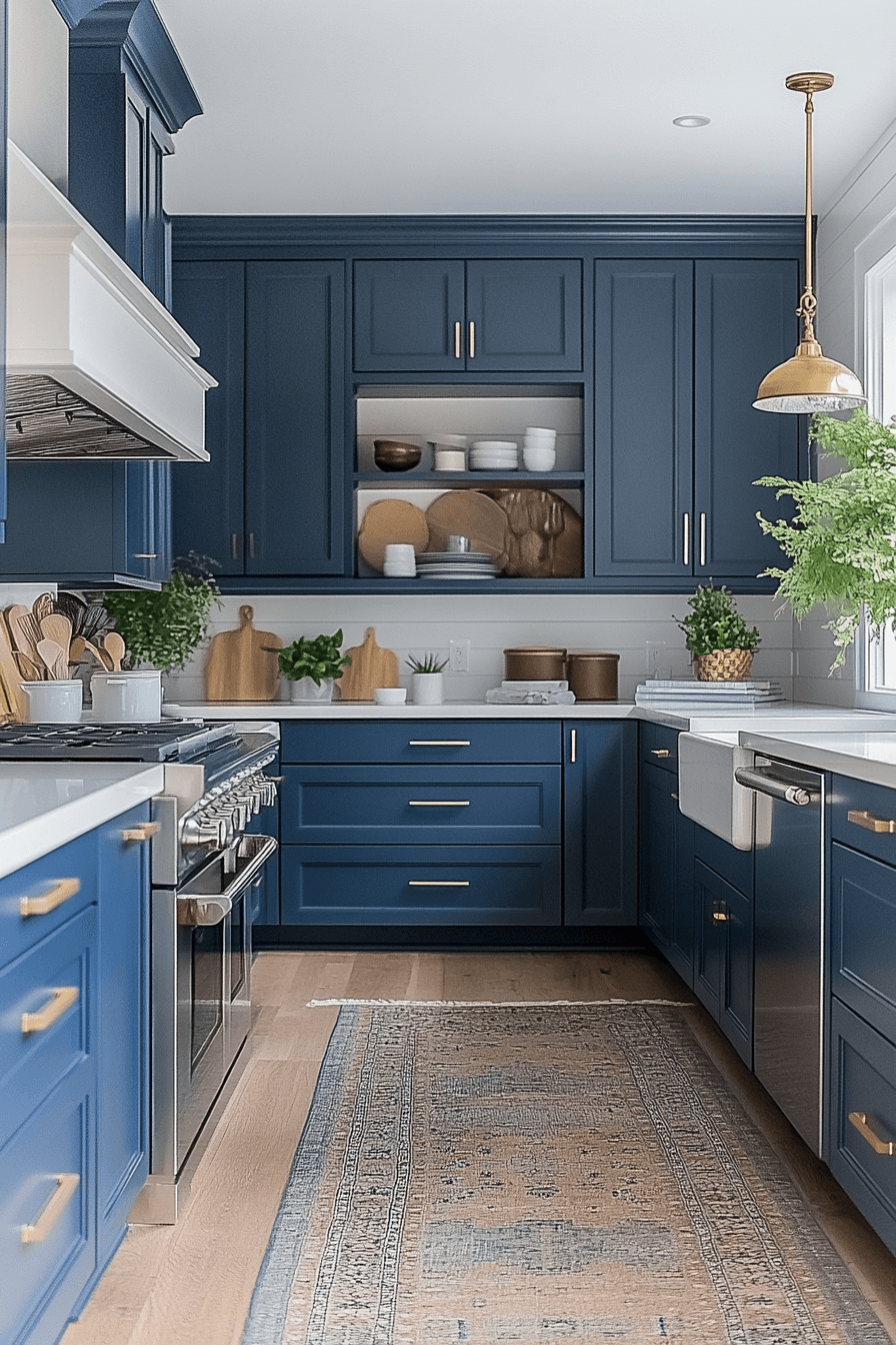 Deep navy accents add dramatic elegance to a tiny cottage kitchen. Used strategically, navy adds richness without shrinking the space. It pairs well with brass and marble finishes. The contrast feels intentional and timeless. The kitchen feels cozy yet bold.