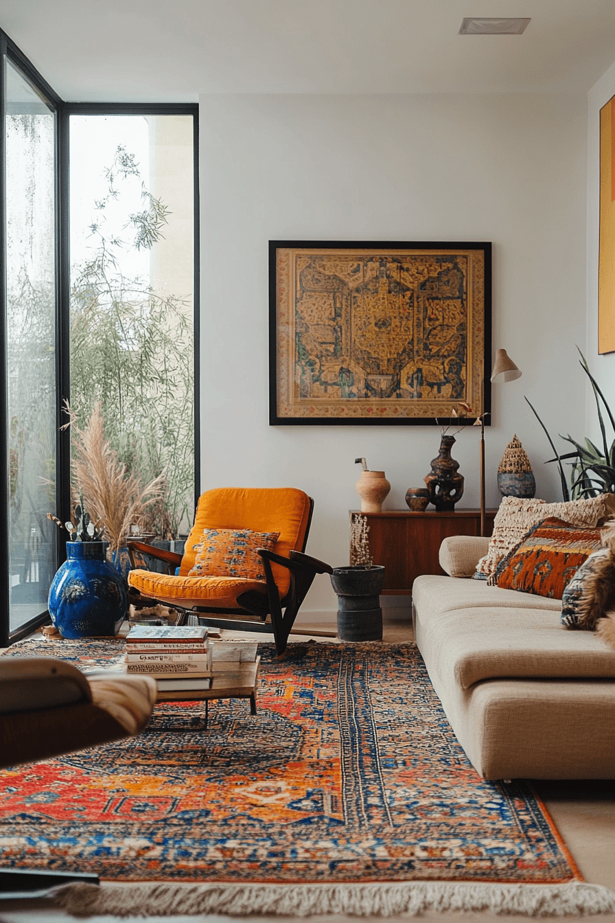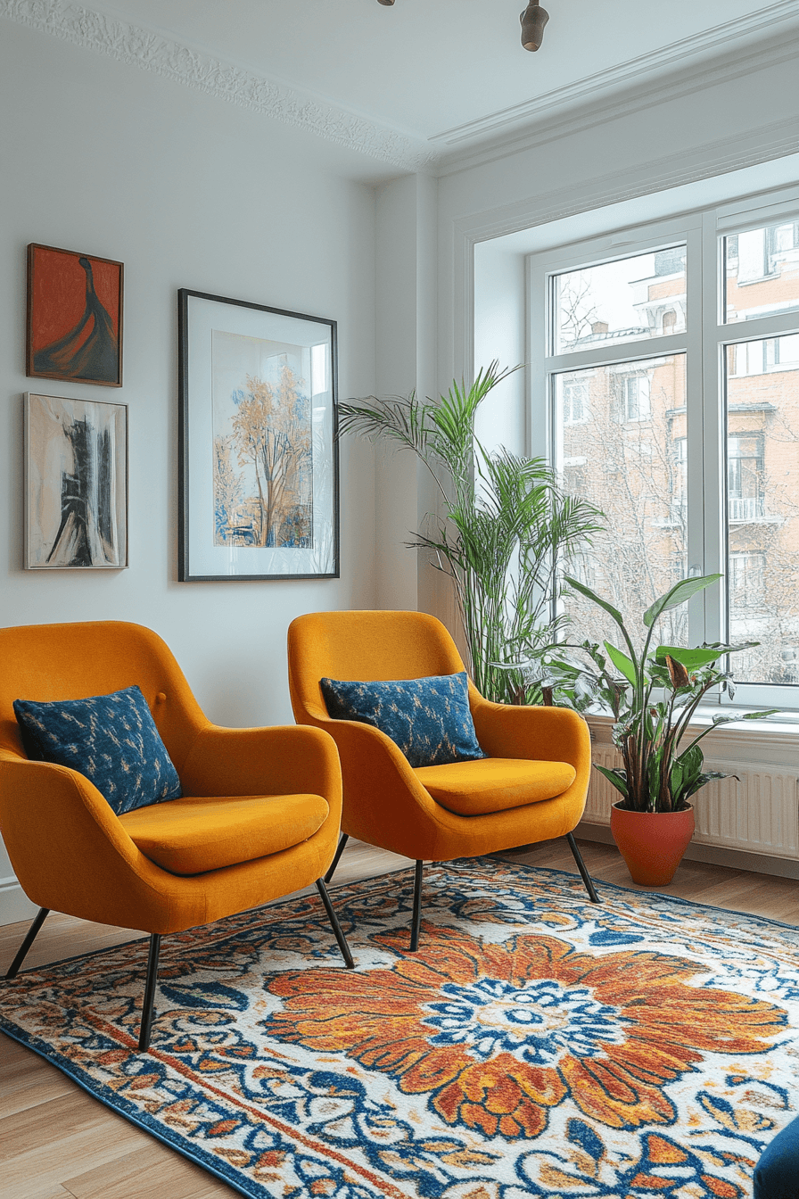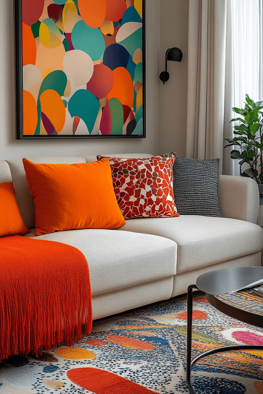 Vivid accents energize a vibey apartment with bold and playful personality. Bright colors stand out against neutral backdrops. Statement art adds rhythm and character. Sleek furniture keeps the layout structured. The space feels lively and expressive. Add bold energy to your vibey apartment.