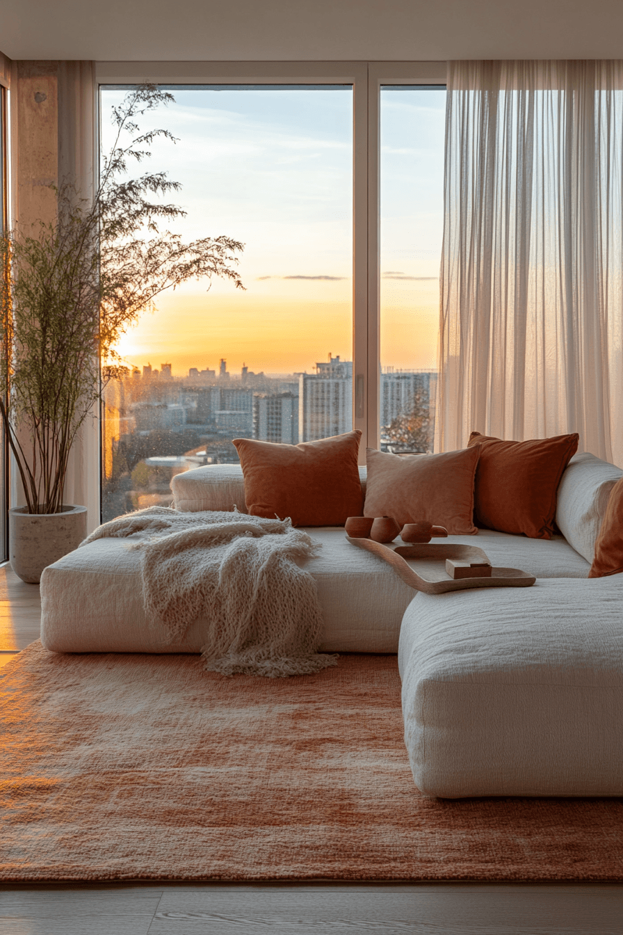 Golden hour tones shape a vibey apartment that feels warm, calming, and inviting. Soft oranges, blush hues, and muted purples create a relaxing palette. Low lighting mimics the glow of sunset beautifully. Cozy seating enhances the laid-back atmosphere. Layered textures add comfort and depth. Create a vibey apartment that feels like endless golden hour.