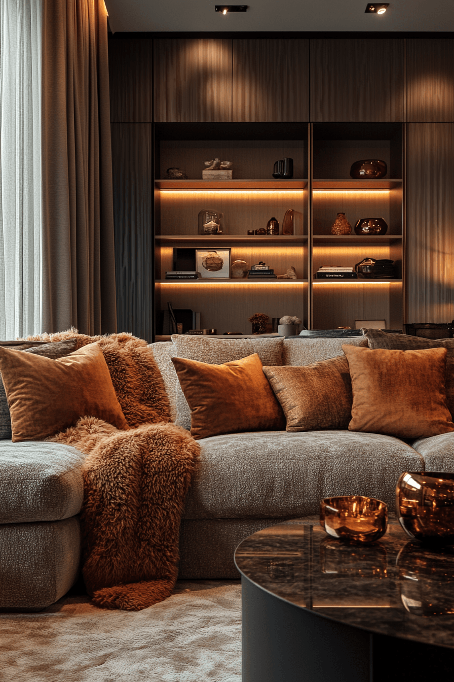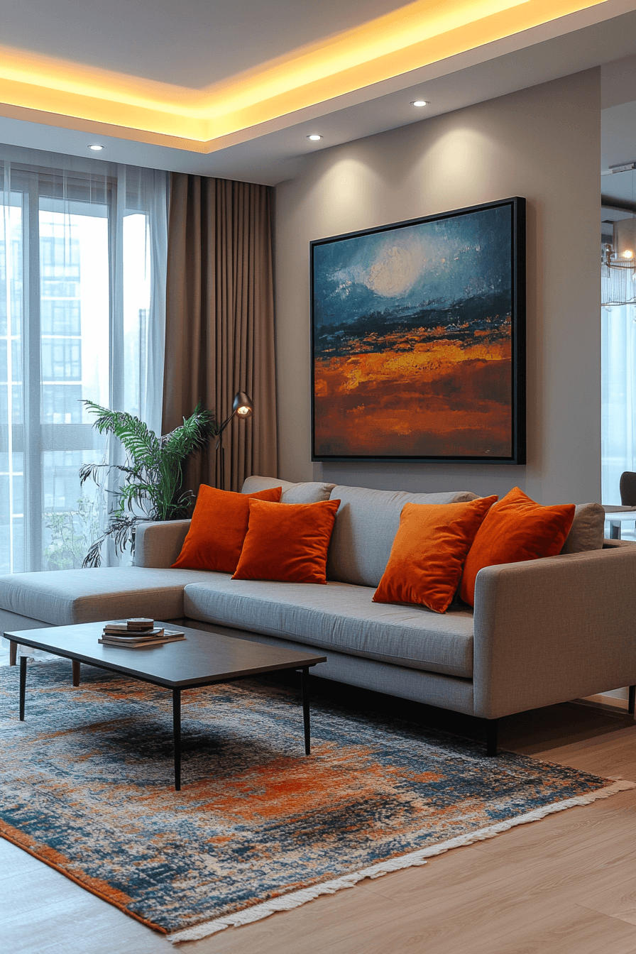 Amber tones bring warmth and depth into a vibey apartment filled with inviting energy. Industrial textures contrast with soft glowing light beautifully. Rust-colored fabrics add richness and comfort. Layered lighting creates a relaxed and intimate atmosphere. Modern details keep the design balanced and fresh. Add a glowing warmth to your vibey apartment that feels welcoming.