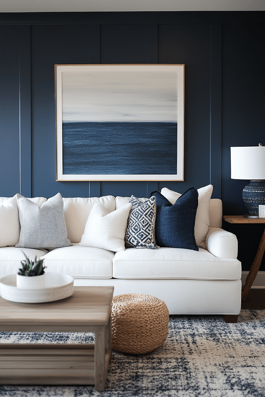 Clean modern lines shape a vibey apartment with sleek coastal-inspired style. Navy tones contrast beautifully with crisp white elements. Streamlined furniture maximizes space efficiently. Metallic accents add polish and refinement. The design feels fresh and balanced. Create a vibey apartment with modern coastal energy.