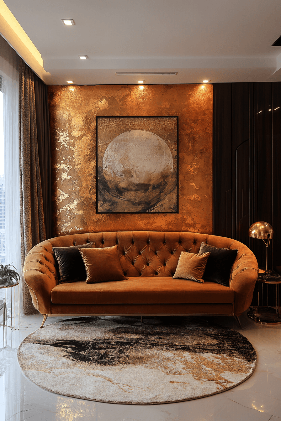 Golden warmth fills a vibey apartment with rich tones and inviting glow. Metallic details enhance the shimmer throughout the space. Deep colors balance the brightness beautifully. Soft textures add comfort and depth. The space feels cozy yet elevated. Add radiant warmth to your vibey apartment.
