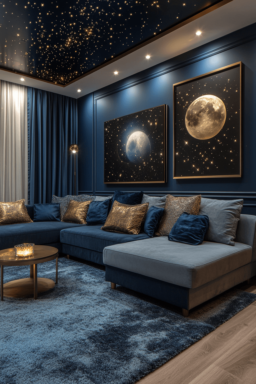 Celestial inspiration turns a vibey apartment into a dreamy, star-filled escape. Dark tones combined with metallic accents mimic the beauty of the night sky. Twinkling lights enhance the magical effect. Decorative elements like constellations and moons anchor the theme. Layered lighting keeps everything soft and cozy. Create a vibey apartment that feels cosmic and enchanting.