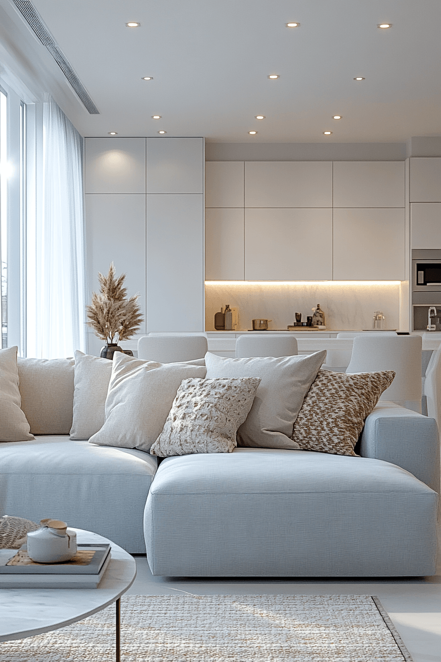 Sky-inspired tones create a vibey apartment that feels open and expansive. Light blues and whites enhance brightness and calmness. Minimal furniture keeps the layout uncluttered. Mirrors expand the sense of space. Soft textures add comfort and warmth. Make your vibey apartment feel light and airy.