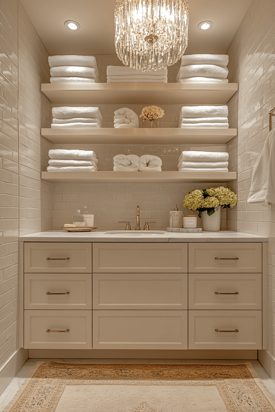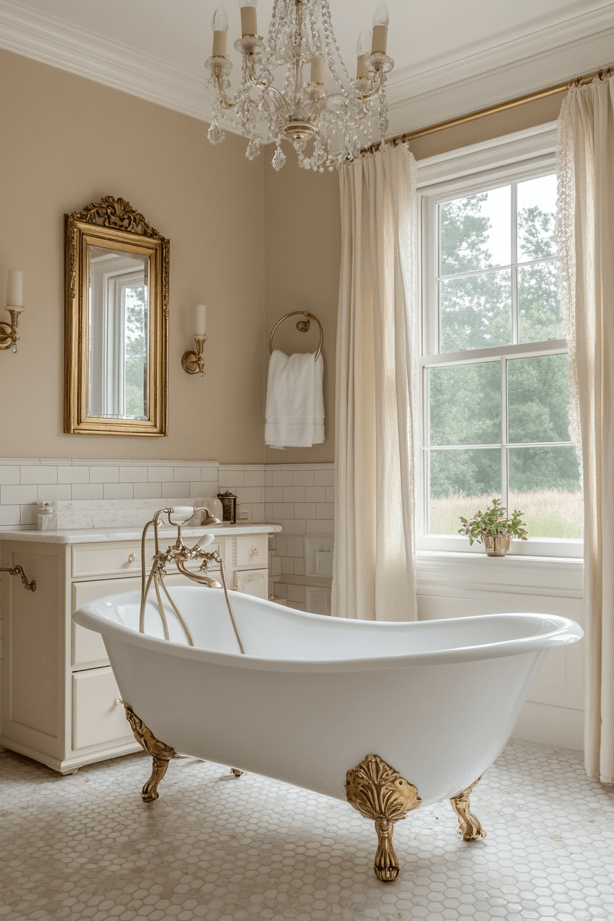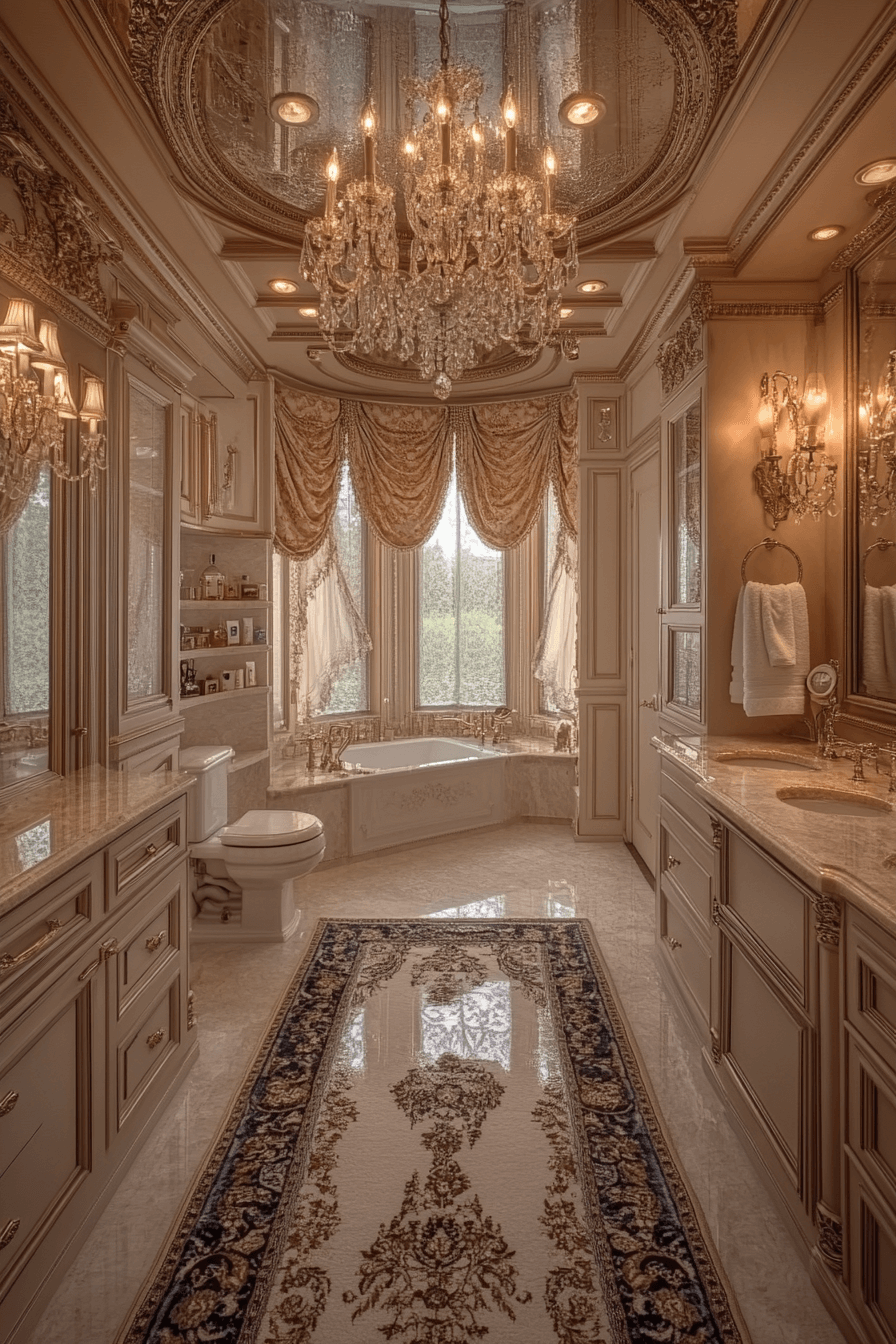 Warm gold accents complement soft neutral tones for a harmonious and inviting space. Gilded mirrors and delicate fixtures add instant elegance. A freestanding tub becomes the centerpiece of the serene layout. Crystal chandeliers provide radiant sparkle. The entire room feels timeless, warm, and richly decorated.
