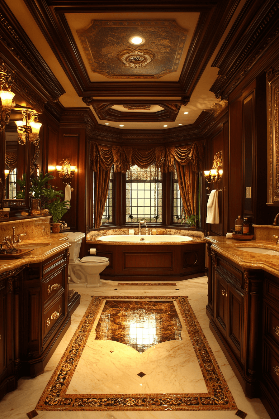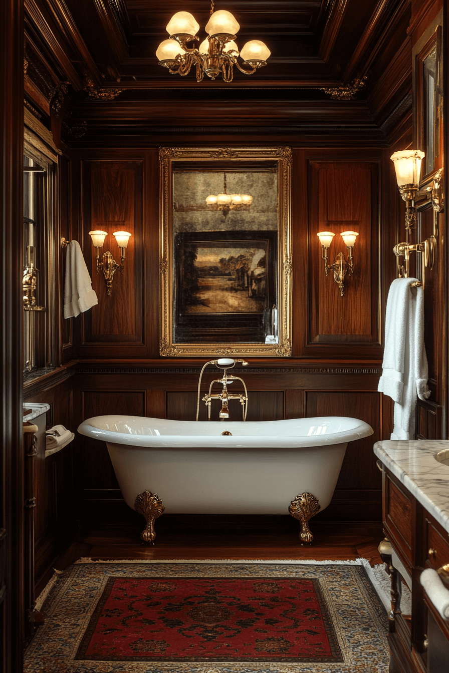 Dark wood and metallic accents create a striking blend of warmth and luxury. Gold-framed mirrors reflect the glow of ornate sconces, illuminating the room with inviting radiance. A freestanding tub framed by rich woodwork brings traditional charm to the space. Soft lighting enhances the depth of the palette, creating a timeless, regal feel. The room feels grounded, grand, and thoroughly elegant.