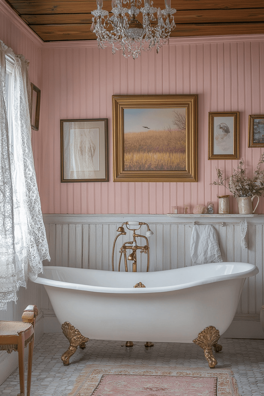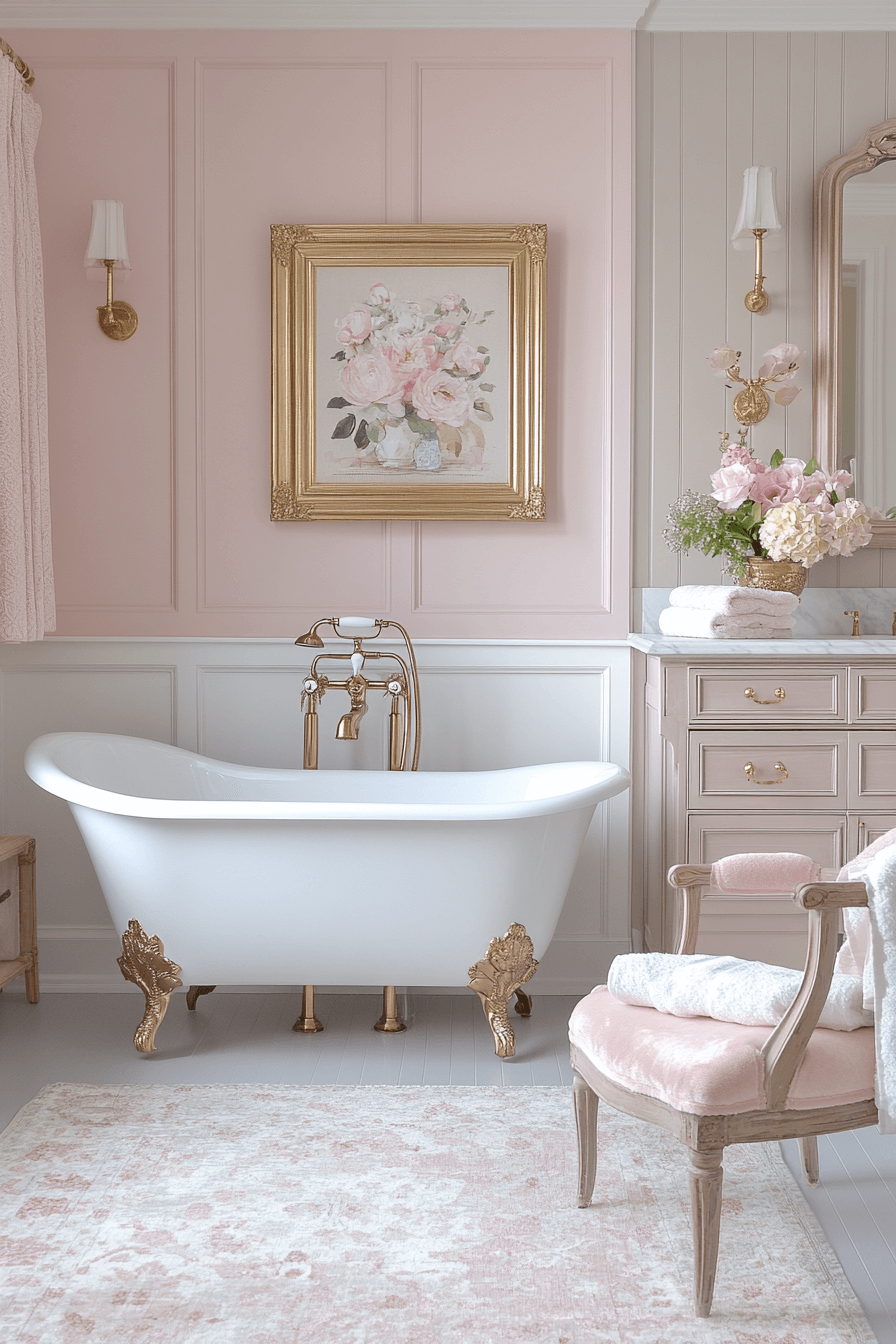 Soft blush tones pair beautifully with rose gold accents for a warm, romantic effect. A vintage tub with rose gold fixtures stands out as a luxurious focal point. Crystal lighting enhances the blush palette with gentle sparkle. Plush rugs and floral patterns add texture and femininity. The entire space feels tender, inviting, and softly glamorous.