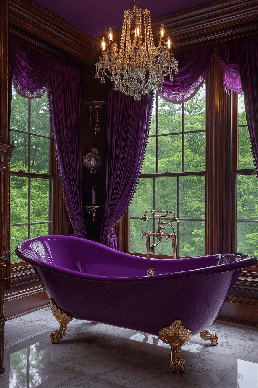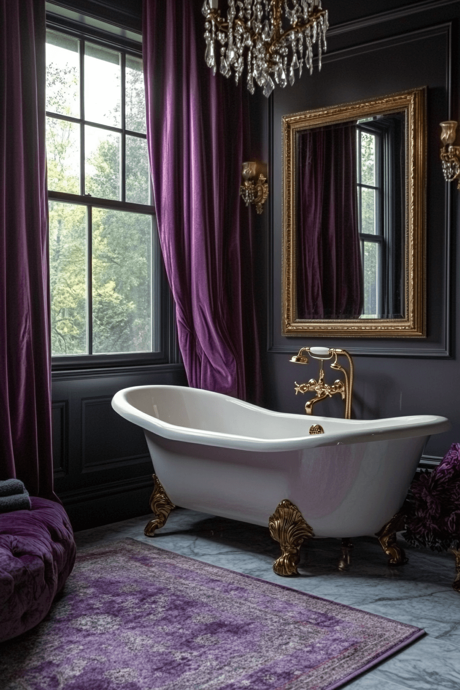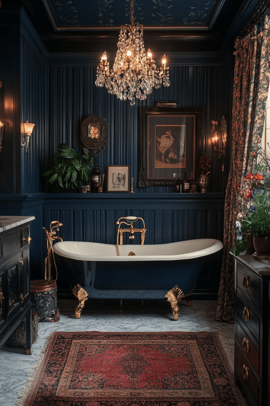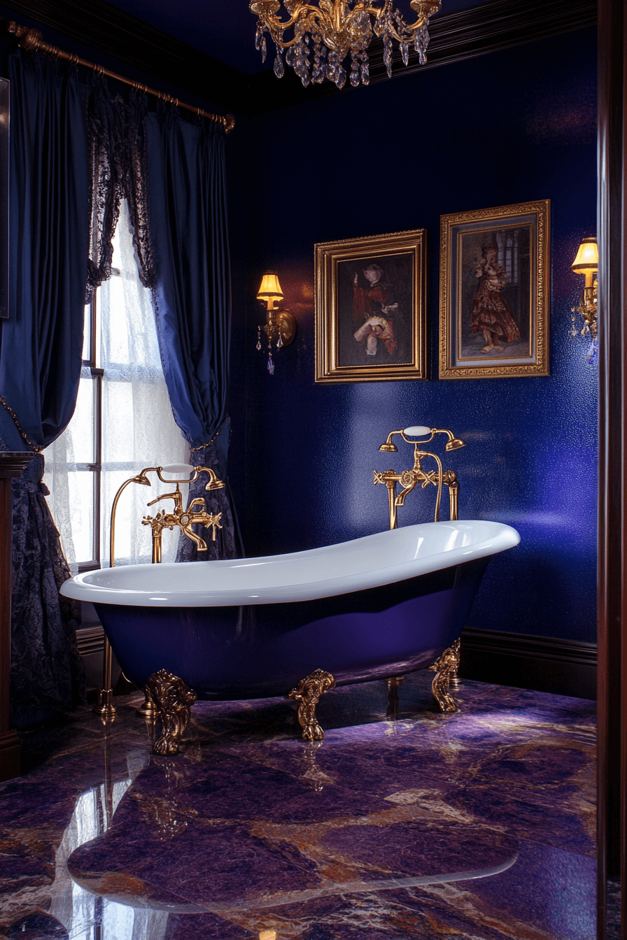Rich midnight tones infuse the room with drama and elegance. Gold and crystal elements stand out vividly against the darker hues. A clawfoot tub beneath a golden mirror creates a striking focal point. Marble flooring introduces a timeless balance to the deep palette. Heavy curtains complete the moody, luxurious feel.